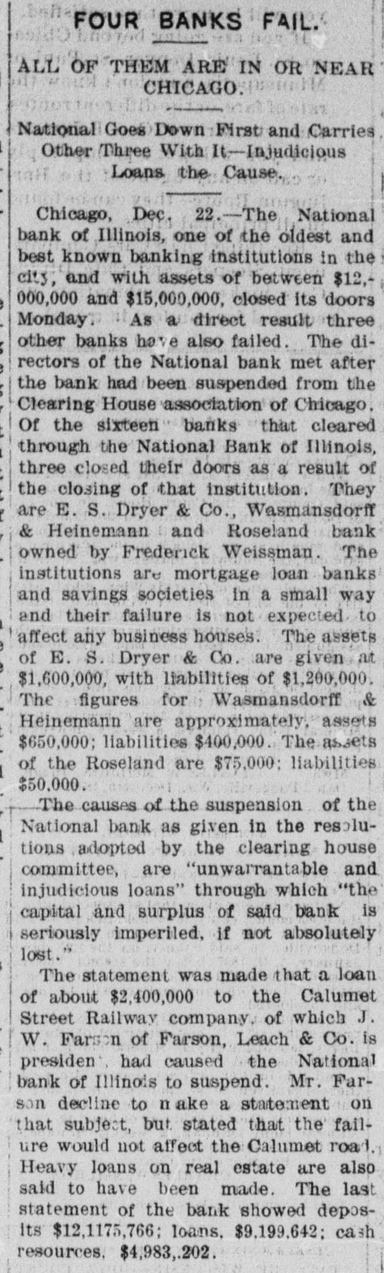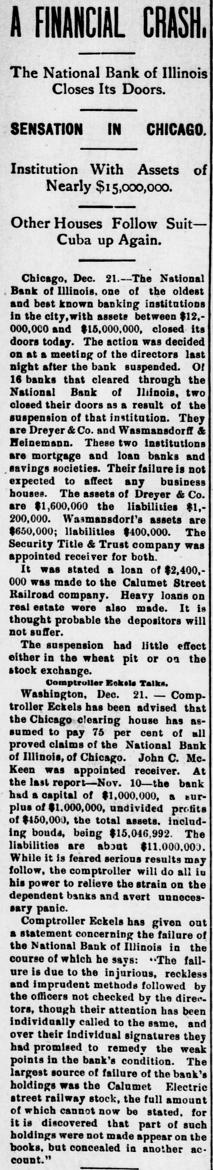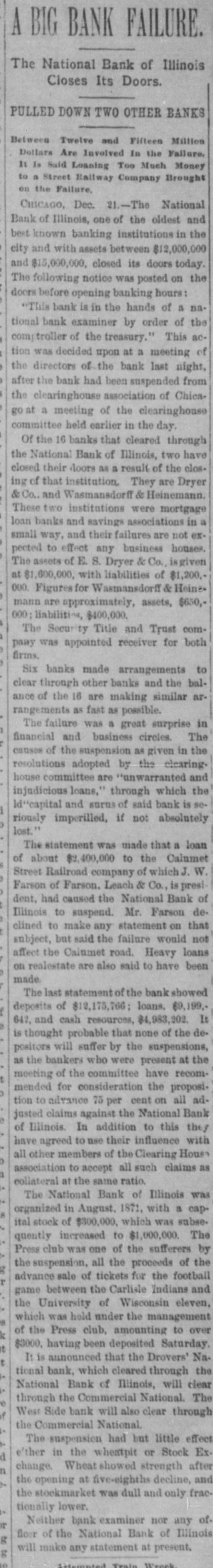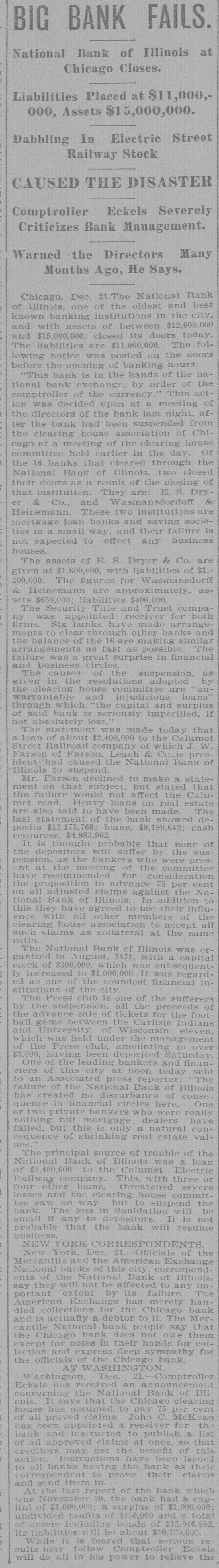 BIC BANK FAILS. National Bank of Illinois at Chicago Closes. Liabilities Placed at $11,000,000, Assets $15,000,000. Dabbling In Electric Street Railway Stock CAUSED THE DISASTER Comptroller Eckels Severely Criticizes Bank Management. Warned the Directors Many Months Ago, He Says Chicago, Dec. 21 The National Bank of Illinois, one of the oldest and best known banking institutions in the city, and with assets of between $12,000,000 and $15,000,000. closed its doors today The liabilities are $11,000,000. The following notice was posted on the doors before the opening of banking hours "This bank is in the hands of the national bank exchange, by order of the comptroller of the currency This action was decided upon at a meeting of the directors of the bank last night after the bank had been suspended from the clearing house association of Chicago at a meeting of the clearing house committee held earlier in the day Of the 16 banks that cleared through the National Bank of Illinois, two closed their doors as a result of the closing of that institution. They are E S. Dry& er & Co., and Wasmansdordoff Heinemann These two institutions are mortgage loan banks and saving societies in a small way, and their failure is not expected to effect any business houses. The assets of E S. Dryer & Co. are given at $1,600,000, with liabilities of $1.200.000. The figures for Wasmansdorft & Heinemann are approximately, assets $650,000 liabilities $400,000. The Security Title and Trust compafor both was appoint ny firms. Six banks have made ments to clear thr ough other banks and the balance of the are making similar arrangements as fast as possib The failure was a great surprise in financial circle: and business The causes of the suspension, as given in the resolutions adopted by the clearing house committee are 'unwarrantable and injudicious loans' through which the capital and surplus of said bank is seriously imperilled, if not absolutely lost The was made today that a loan of about $2,400,000 to the Calumet Street Railroad company of which J W Farson of Farson, Leach Co..is president had caused the National Bank of to suspend. Illinois Mr Farson declined to make a statement on that subject but stated that the failure would not affect the Calumet road. Heavy loans on real estate are also said to have been made The last statement of the bank showed deposits $12,175,766 loans, $9,199,642; cash $4,983,902 It is thought probable that none of the depositor will suffer by the suspension, as the bankers who were presthe of at the committee have for consideration the proposition to advance per cent on all adjusted claims against the National Bank of Illinois In addition to this they have agreed to use their influence with all other members of the clearing house association to accept all such claims as collateral at the same ratio The National Bank of Illinois was organized in August, 1871. with a capital stock of $300,000 which was subsequentlv increased to $1,000,000 It was regardone of the soundest financial inthe of stitutions The Press club is one of the sufferers by the suspension, all the proceeds of the advance sale of tickets for the football game between the Carlisle Indians and University of Wisconsin eleven. which was held under the management the Press club, amounting to over 000, having been deposited Saturday, One of the leading bankers and finaneiers of this city at noon today said to an Associated press reporter The failure of the National Bank of Illinois has created no disturbance of consequence financial circles here One private bankers who really nothing but dealers have failed, but this is only a natural consequence of shrinking real estate valThe principal source of trouble of the National Bank of Illinois was a loan of $2,400,000 to the Calumet Electric Railway company This with three or four loans, threatened severe losses and the clearing house committee saw way but to suspend the bank. The loss in liquidation be small if any to depositors It is not probable that the bank will resume business NEW YORK CORRESPONDENTS New York Dec. 21.-Officials of the Mercantile and the American Exchange National banks of this respond ents the National Bank Illinois say they will not be affected any important extent by its failure The American Exchange has merely handled collections for the Chicago bank and is actually a debtor to it The Mercantile National bank people say that the Chicago bank does not them except for notes in their hands for coland deep sympathy for the officials of the Chicago bank AT WASHINGTON Washington, Dec Comptroller Eckels has received an the National Bank of Illinois. It says that the Chicago clearing house has to pay of all proved claims John C. McK ean been appointed a receiver for bank and to publish a list of all at so that may get the benefit of this issued banks ing the bank as their prove their claims in. them send the report of the bank which 30. the bank had a cap of $1,000,000 surplus of $1,000,000 undivided of $450.000 and a total of bonds 5.046.952, its liabilities will be about $10,100,000. While it is feared that serious results may follow Comptroller Eckels will do all in his power to relieve the