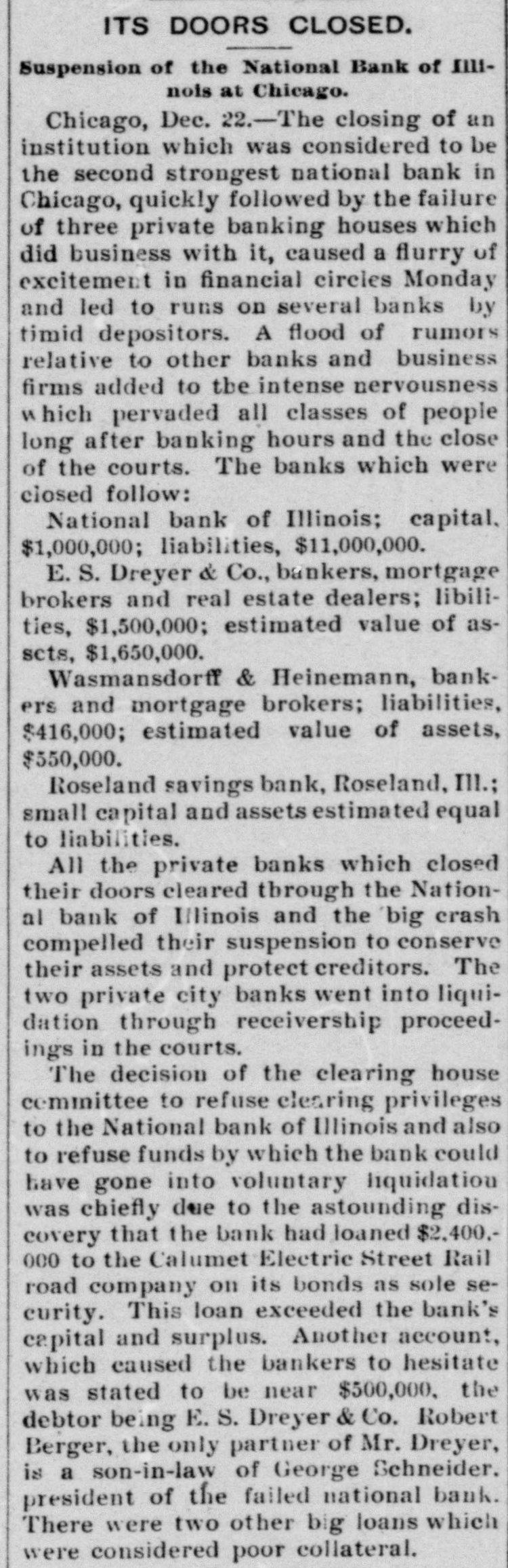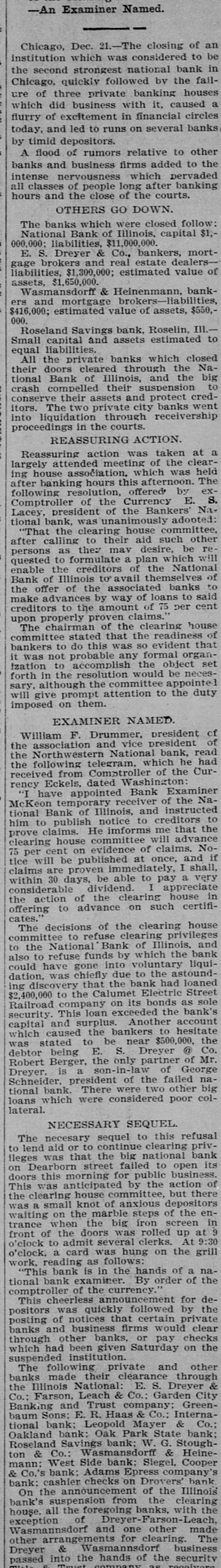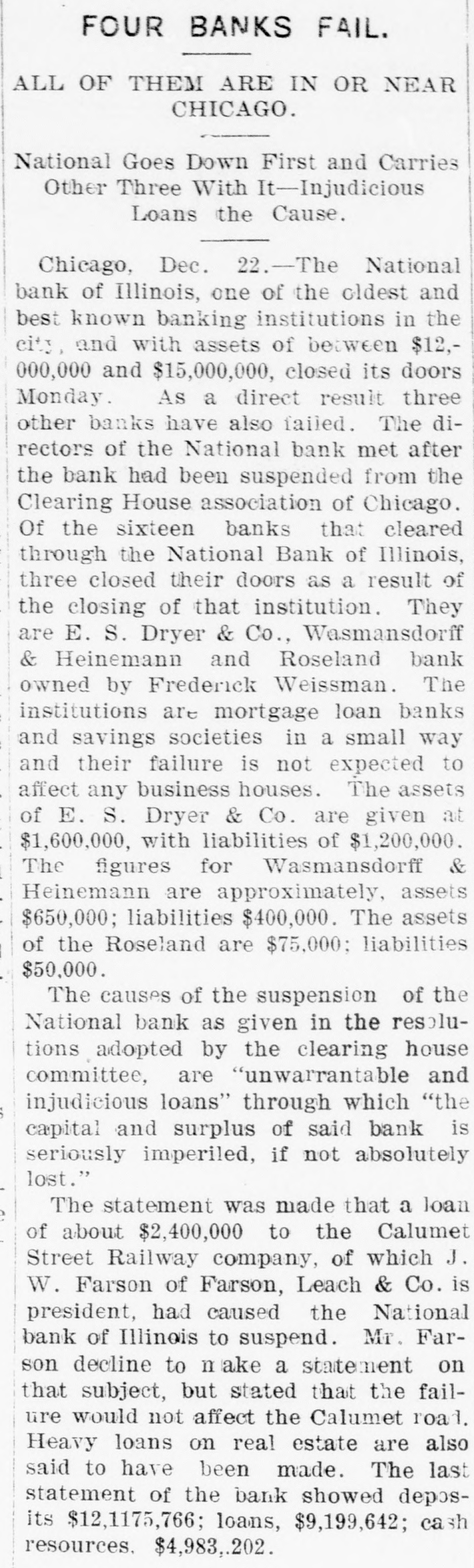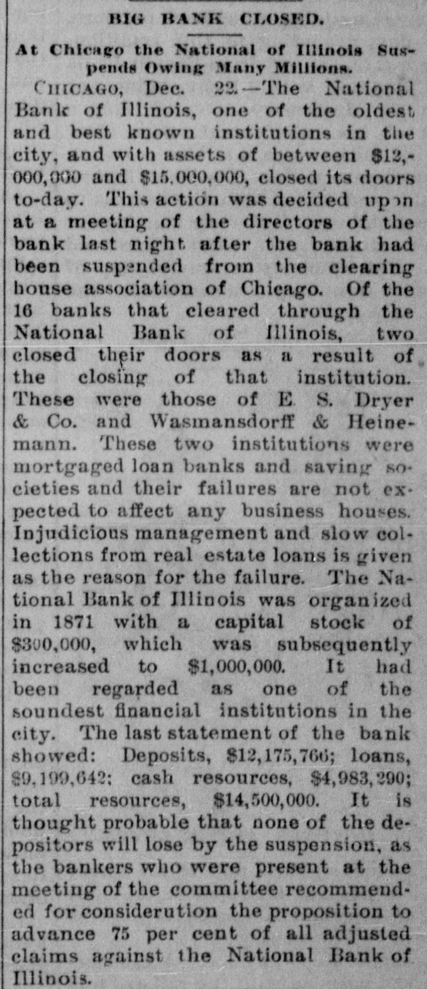 BIC BANK FAILS. National Bank of Illinois at Chicago Closes. Liabilities Placed at $11,000,000, Assets $15,000,000. Dabbling In Electric Street Railway Stock CAUSED THE DISASTER Comptroller Eckels Severely Criticizes Bank Management. Warned the Directors Many Months Ago, He Says Chicago, Dec. 21 The National Bank of Illinois, one of the oldest and best known banking institutions in the city, and with assets of between $12,000,000 and $15,000,000. closed its doors today The liabilities are $11,000,000. The following notice was posted on the doors before the opening of banking hours "This bank is in the hands of the national bank exchange, by order of the comptroller of the currency This action was decided upon at a meeting of the directors of the bank last night after the bank had been suspended from the clearing house association of Chicago at a meeting of the clearing house committee held earlier in the day Of the 16 banks that cleared through the National Bank of Illinois, two closed their doors as a result of the closing of that institution. They are E S. Dry& er & Co., and Wasmansdordoff Heinemann These two institutions are mortgage loan banks and saving societies in a small way, and their failure is not expected to effect any business houses. The assets of E S. Dryer & Co. are given at $1,600,000, with liabilities of $1.200.000. The figures for Wasmansdorft & Heinemann are approximately, assets $650,000 liabilities $400,000. The Security Title and Trust compafor both was appoint ny firms. Six banks have made ments to clear thr ough other banks and the balance of the are making similar arrangements as fast as possib The failure was a great surprise in financial circle: and business The causes of the suspension, as given in the resolutions adopted by the clearing house committee are 'unwarrantable and injudicious loans' through which the capital and surplus of said bank is seriously imperilled, if not absolutely lost The was made today that a loan of about $2,400,000 to the Calumet Street Railroad company of which J W Farson of Farson, Leach Co..is president had caused the National Bank of to suspend. Illinois Mr Farson declined to make a statement on that subject but stated that the failure would not affect the Calumet road. Heavy loans on real estate are also said to have been made The last statement of the bank showed deposits $12,175,766 loans, $9,199,642; cash $4,983,902 It is thought probable that none of the depositor will suffer by the suspension, as the bankers who were presthe of at the committee have for consideration the proposition to advance per cent on all adjusted claims against the National Bank of Illinois In addition to this they have agreed to use their influence with all other members of the clearing house association to accept all such claims as collateral at the same ratio The National Bank of Illinois was organized in August, 1871. with a capital stock of $300,000 which was subsequentlv increased to $1,000,000 It was regardone of the soundest financial inthe of stitutions The Press club is one of the sufferers by the suspension, all the proceeds of the advance sale of tickets for the football game between the Carlisle Indians and University of Wisconsin eleven. which was held under the management the Press club, amounting to over 000, having been deposited Saturday, One of the leading bankers and finaneiers of this city at noon today said to an Associated press reporter The failure of the National Bank of Illinois has created no disturbance of consequence financial circles here One private bankers who really nothing but dealers have failed, but this is only a natural consequence of shrinking real estate valThe principal source of trouble of the National Bank of Illinois was a loan of $2,400,000 to the Calumet Electric Railway company This with three or four loans, threatened severe losses and the clearing house committee saw way but to suspend the bank. The loss in liquidation be small if any to depositors It is not probable that the bank will resume business NEW YORK CORRESPONDENTS New York Dec. 21.-Officials of the Mercantile and the American Exchange National banks of this respond ents the National Bank Illinois say they will not be affected any important extent by its failure The American Exchange has merely handled collections for the Chicago bank and is actually a debtor to it The Mercantile National bank people say that the Chicago bank does not them except for notes in their hands for coland deep sympathy for the officials of the Chicago bank AT WASHINGTON Washington, Dec Comptroller Eckels has received an the National Bank of Illinois. It says that the Chicago clearing house has to pay of all proved claims John C. McK ean been appointed a receiver for bank and to publish a list of all at so that may get the benefit of this issued banks ing the bank as their prove their claims in. them send the report of the bank which 30. the bank had a cap of $1,000,000 surplus of $1,000,000 undivided of $450.000 and a total of bonds 5.046.952, its liabilities will be about $10,100,000. While it is feared that serious results may follow Comptroller Eckels will do all in his power to relieve the