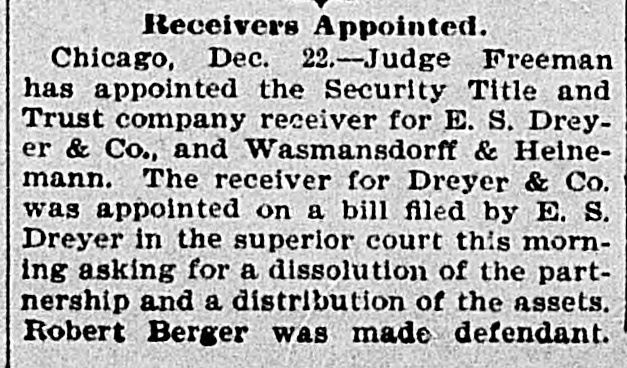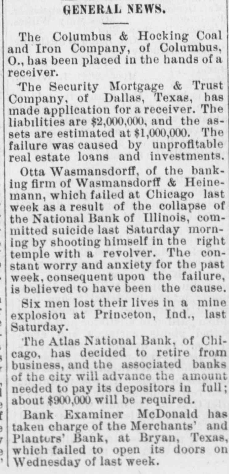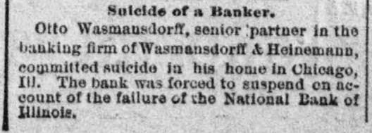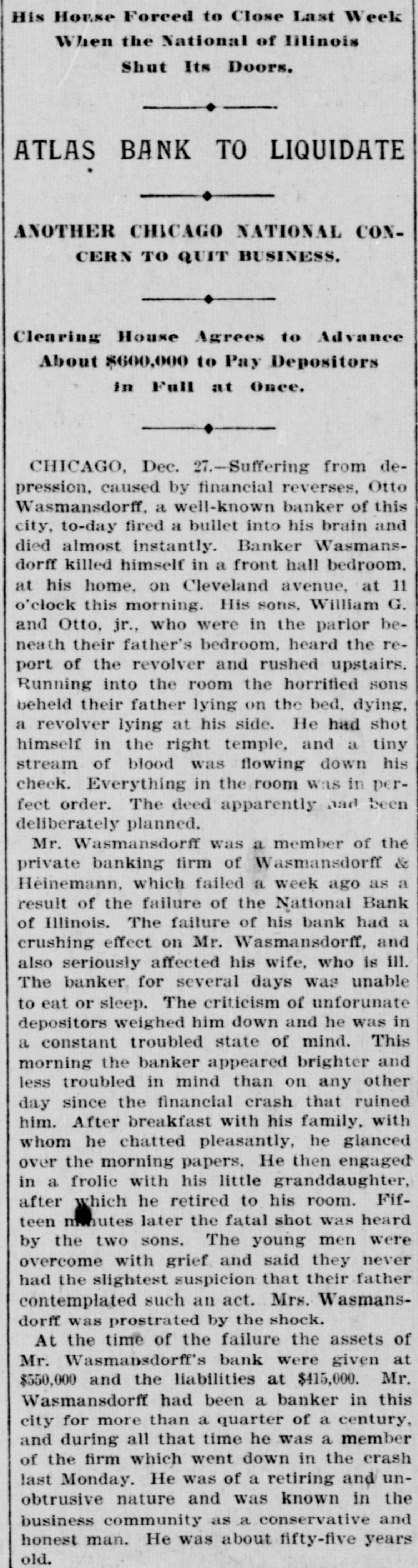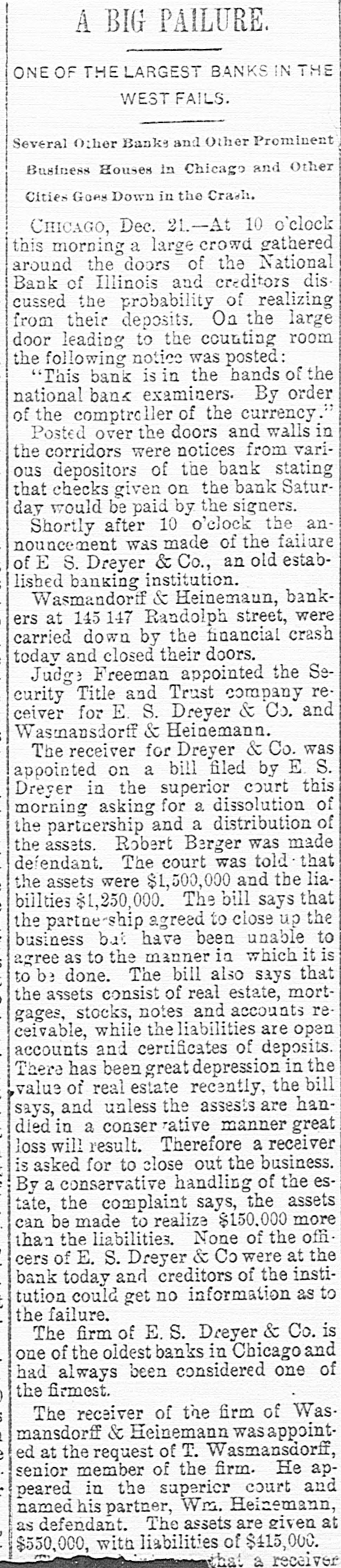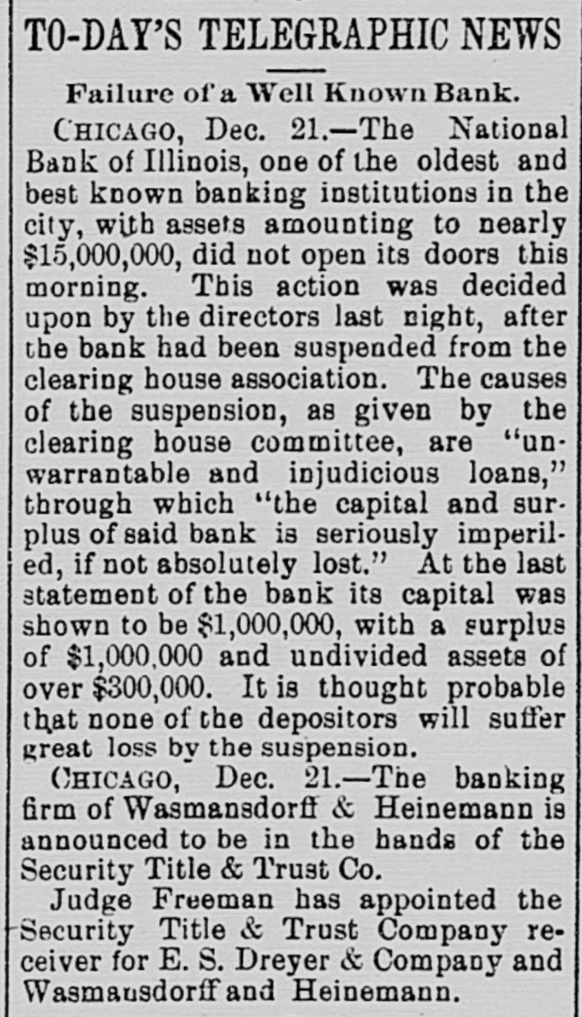 BIC BANK FAILS. National Bank of Illinois at Chicago Closes. Liabilities Placed at $11,000,000, Assets $15,000,000. Dabbling In Electric Street Railway Stock CAUSED THE DISASTER Comptroller Eckels Severely Criticizes Bank Management. Warned the Directors Many Months Ago, He Says Chicago, Dec. 21 The National Bank of Illinois, one of the oldest and best known banking institutions in the city, and with assets of between $12,000,000 and $15,000,000. closed its doors today The liabilities are $11,000,000. The following notice was posted on the doors before the opening of banking hours "This bank is in the hands of the national bank exchange, by order of the comptroller of the currency This action was decided upon at a meeting of the directors of the bank last night after the bank had been suspended from the clearing house association of Chicago at a meeting of the clearing house committee held earlier in the day Of the 16 banks that cleared through the National Bank of Illinois, two closed their doors as a result of the closing of that institution. They are E S. Dry& er & Co., and Wasmansdordoff Heinemann These two institutions are mortgage loan banks and saving societies in a small way, and their failure is not expected to effect any business houses. The assets of E S. Dryer & Co. are given at $1,600,000, with liabilities of $1.200.000. The figures for Wasmansdorft & Heinemann are approximately, assets $650,000 liabilities $400,000. The Security Title and Trust compafor both was appoint ny firms. Six banks have made ments to clear thr ough other banks and the balance of the are making similar arrangements as fast as possib The failure was a great surprise in financial circle: and business The causes of the suspension, as given in the resolutions adopted by the clearing house committee are 'unwarrantable and injudicious loans' through which the capital and surplus of said bank is seriously imperilled, if not absolutely lost The was made today that a loan of about $2,400,000 to the Calumet Street Railroad company of which J W Farson of Farson, Leach Co..is president had caused the National Bank of to suspend. Illinois Mr Farson declined to make a statement on that subject but stated that the failure would not affect the Calumet road. Heavy loans on real estate are also said to have been made The last statement of the bank showed deposits $12,175,766 loans, $9,199,642; cash $4,983,902 It is thought probable that none of the depositor will suffer by the suspension, as the bankers who were presthe of at the committee have for consideration the proposition to advance per cent on all adjusted claims against the National Bank of Illinois In addition to this they have agreed to use their influence with all other members of the clearing house association to accept all such claims as collateral at the same ratio The National Bank of Illinois was organized in August, 1871. with a capital stock of $300,000 which was subsequentlv increased to $1,000,000 It was regardone of the soundest financial inthe of stitutions The Press club is one of the sufferers by the suspension, all the proceeds of the advance sale of tickets for the football game between the Carlisle Indians and University of Wisconsin eleven. which was held under the management the Press club, amounting to over 000, having been deposited Saturday, One of the leading bankers and finaneiers of this city at noon today said to an Associated press reporter The failure of the National Bank of Illinois has created no disturbance of consequence financial circles here One private bankers who really nothing but dealers have failed, but this is only a natural consequence of shrinking real estate valThe principal source of trouble of the National Bank of Illinois was a loan of $2,400,000 to the Calumet Electric Railway company This with three or four loans, threatened severe losses and the clearing house committee saw way but to suspend the bank. The loss in liquidation be small if any to depositors It is not probable that the bank will resume business NEW YORK CORRESPONDENTS New York Dec. 21.-Officials of the Mercantile and the American Exchange National banks of this respond ents the National Bank Illinois say they will not be affected any important extent by its failure The American Exchange has merely handled collections for the Chicago bank and is actually a debtor to it The Mercantile National bank people say that the Chicago bank does not them except for notes in their hands for coland deep sympathy for the officials of the Chicago bank AT WASHINGTON Washington, Dec Comptroller Eckels has received an the National Bank of Illinois. It says that the Chicago clearing house has to pay of all proved claims John C. McK ean been appointed a receiver for bank and to publish a list of all at so that may get the benefit of this issued banks ing the bank as their prove their claims in. them send the report of the bank which 30. the bank had a cap of $1,000,000 surplus of $1,000,000 undivided of $450.000 and a total of bonds 5.046.952, its liabilities will be about $10,100,000. While it is feared that serious results may follow Comptroller Eckels will do all in his power to relieve the