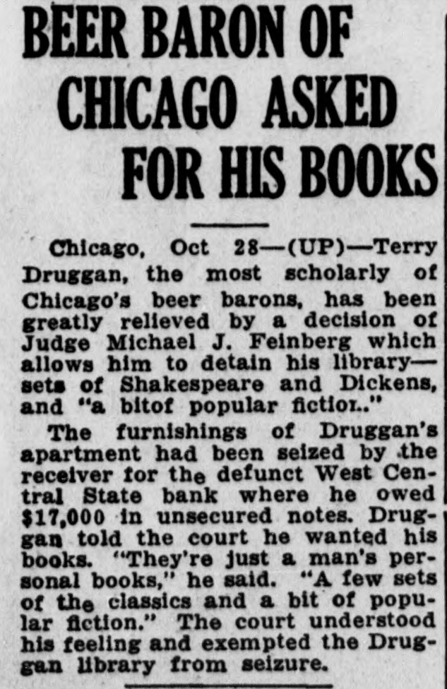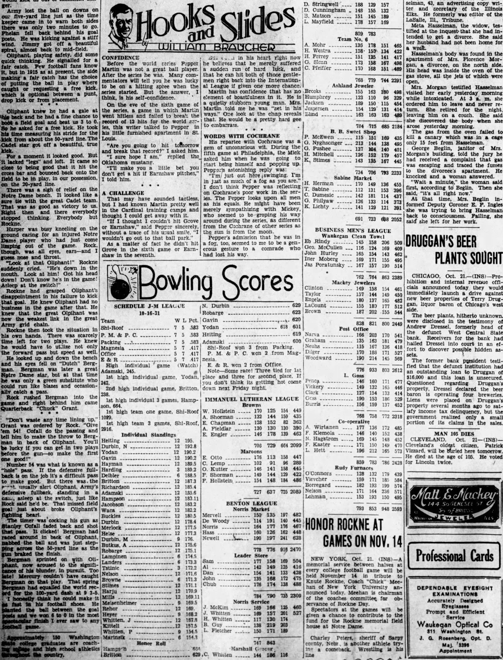 Stringwell selman, 43, an 188 129 157 ter and secretary of the Illinois Cunningham 132 formerly was editor of the Matson LaSalle, Tribune. Mayfield Meta the widow, testified the inquest that had 809 tended get divorce. She said Team her husband had not been home for Mohr 136 151 Westra Hasselman's body found in the H. Ferrey 141 417 apartment of Mrs. Florence Mordivorcee, the north side. Pfeiffer 170 His head was inside the oven of the gas stove, all the jets of which were 768 779 744 Ashland Mrs. Morgan testified Hasselman Brooks 155 163 180 visited her early yesterday morning Humphrey 123 while intoxicated. At Jacksen 189 115 ordered him to and never Jespersen turn. retired for the night, Blind 163 163 leaving him couch. She said on she the when she 784 715 685 2184 arose yesterday Sweet Shop The gas from the oven failed McEwen 151 kill which was in 169 435 cage Nyghsonger 213 144 138 only 15 feet from Hasselman. Pushee 137 George Beglin, janitor of Mrs. 140 Mitchell 126 152 Morgan's the jury he 179 Stimes 143 had received complaint gas 445 was escaping traced the fumes 734 the divorcee's apartment. He 706 793 Sabine knocked and answered. Market H. "Wait minute," the woman said Herman 170 149 136 455 first, according to Beglin. Then she Sabine 112 131 153 said, all right now." Dumesic 142 114 At that time, Mrs. Beglin inPhilyaw 126 formed Deputy Coroner E. Ingles K. Lichty 141 she trying to bring Hasselman back consciousness. Failing, she 691 723 638 she left for her work. BUSINESS MEN'S LEAGUE Wankegan Clean Eb Rindy DRUGGAN'S 145 Geo. McCullen 116 169 John Hurley 165 143 Iner Moberg PLANTS 169 171 155 Jas Poratunsky 167 190 514 762 764 CHICAGO. Oct. 863 2389 Mackey Jewelers hibition internal revenue offiClinton 149 cials today they would Taylor 157 immediately launch drive against Engels beer properties of Terry Drug180 165 629 LaCount gan, liquor baron of Chicago's west SCHEDULE N. Durbin 155 180 623 Brown 187 202 544 Robarge The beer plants, hitherto unknown. Gavin 620 Team were disclosed in the testimony 828 821 800 2449 Shi-Roof Yodan Andrew Dressel, formerly head Post Office the defunct West Central State Heiting 619 Narva 166 203 170 541 bank. Receivers for the bank had 600 Graham 135 163 479 Packing Adamski hailed Dressel into court from Packing Neuhs 115 167 136 418 Magnesia won fort to discover possible hidden from Mag- Dilger 170 186 Office & won sets. Woodward 190 214 569 nesia The former bank president testiindividual won from Office High game (Watch) fied that the defunct institution had Three tied for 1st 776 933 2612 Adamski, loan to Druggan 1st individual Yodan, place and three for second place. $16,000 and this loan is unsecured high game, hot come Penca 160 242. you don't think getting Questioned Druggan's Vickery 149 132 2nd high individual game, down next Friday night. property, Dressel declared Clark 127 154 238. baron operating four breweries. IMMANUEL LUTHERAN LEAGUE 190 153 186 1st high individual 3 games, Hamp- Liens placed Druggan's Browns Burris 156 159 452 property months ago to satShi-Roof W. Hollstein 170 125 449 1st high team one game, isfy income tax delinquency, but the Shorman 144 768 758 2318 realized only small 152 portion of its claims in the sales. 1st high team games, Chapman 130 Wirtanen 136 485 2916. Fieldlar 130 178 Klemola 146 140 MAN 105 DIES Individual Standings Engler Hagstrom 145 CLEVELAND. Oct. Heiting 706 Kaster 171 149 Cleveland's oldest citizen. Patrick Durbin, N 192.8 729 Hett 196 165 Vizzard, will be buried here tomorrow. Yodan 190.2 Maroons 113 447 He died at the age of 105. He voted Gavin 190.2 Otto 176 859 783 for Lincoln twice. Hayman Lemp 102 146 141 Rudy Furnaces Harding Kutter O'Connors Deibler 188.5 Shorman Vievcher 159 Britton 187.3 Hollstein 154 148 184 Borregard 182 Richardson Nelson 171 164 Adamski 185.6 727 637 153 193 150 495 Hampson 183.2 BENTON LEAGUE Jacobson Norris Market 793 853 948 2593 Waca 182.2 fighting heart 180.5 Mervell Buckles timer was cocking his gun as De Woody Durbin 178.4 ROCKNE Stanley Cofall faded back and shot Norris 176 Merlock 177.5 pass. It clicked! Bergman Hass 160 raced in back of Oliphant, Newell Durbin, M GAMES ON NOV. nabbed the ball and was stepthe 50-yard line as the 778 776 Robarge braked the finish. Leader Store Professional Cards Lampinen 174.5 Bergman sprinted with NEW YORK, Oct. 21. 173.3 Sam 504 Landers aroused the signifi- halves Tstinic 172.2 his blunder, in pursuit. Too every college football game will Nelson Dan Mercury couldn't have caught November tribute Browne 171.3 135 Bergman on that play. That spring Knute Rockne, Coach "Chick" MeeChub 176 Stimes equalled the world han of New York University DEPENDABLE EYESIGHT Harju 170.9 100-yard dash nounced today. Meehan chairman 784 790 Mills the honestly think could make of coaches committee for obNorris Service Accurately Designed Meisenheimer 169.5 of his football shoes. He servance Rockne Day. McKim 125 460 Eyeglasses Rehor 169 the ball between the goal Spectators at the games will Prompt and Efficient Whitten 169 in the Heyer given chance contribute the Service 167.8 Whitten 117 finish ever saw to any fund for the Rockne memorial field 157.5 Guy 138 Waukegan Optical Co Kittell house at Notre Dame game. Fletcher 150 311 Washington 150 Washington Marinsik Charley Peters, sheriff of Sarpy Rosenberg, Opt. D. graduates coach- Roll 843 college county, another athlete Maj. school athletics Marshall comeback. Wrestling Appointment country. Britton Whitten 144 116 line