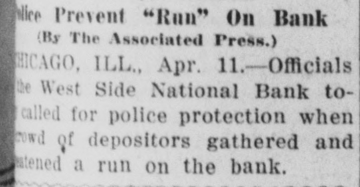 Short AP report (with OCR errors) says police were called when depositors gathered and threatened a run on the West Side National Bank in Chicago on Apr 11, 1923. No suspension, closure, or reopening is mentioned. Cause of the agitation is not specified in the article.