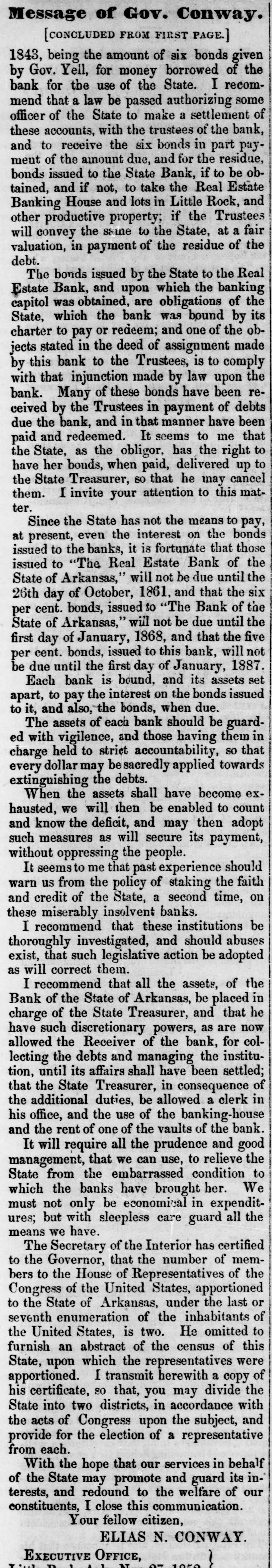 Message of Gov. Conway. [CONCLUDED FROM FIRST PAGE.] 1843, being the amount of six bonds given by Gov. Yeil, for money borrowed of the bank for the use of the State. I recommend that a law be passed authorizing some officer of the State to make a settlement of these accounts, with the trustees of the bank, and to receive the six bonds in part payment of the amount due, and for the residue, bonds issued to the State Bank, if to be obtained, and if not, to take the Real Estate Banking House and lots in Little Rock, and other productive property; if the Trustees will convey the same to the State, at a fair valuation, in payment of the residue of the debt. The bonds issued by the State to the Real Estate Bank, and upon which the banking capitol was obtained, are obligations of the State, which the bank was bound by its charter to pay or redeem; and one of the objects stated in the deed of assignment made by this bank to the Trustees, is to comply with that injunction made by law upon the bank. Many of these bonds have been received by the Trustees in payment of debts due the bank, and in that manner have been paid and redeemed. It seems to me that the State, as the obligor, has the right to have her bonds, when paid, delivered up to the State Treasurer, so that he may cancel them. I invite your attention to this matter. Since the State has not the means to pay, at present, even the interest on the bonds issued to the banks, it is fortunate that those issued to "The Real Estate Bank of the State of Arkansas," will not be due until the 26th day of October, 1861, and that the six per cent. bonds, issued to "The Bank of the State of Arkansas," will not be due until the first day of January, 1868, and that the five per cent. bonds, issued to this bank, will not be due until the first day of January, 1887. Each bank is bound, and its assets set apart, to pay the interest on the bonds issued to it, and also, the bonds, when due. The assets of each bank should be guarded with vigilence, and those having them in charge held to strict accountability, so that every dollar may besacredly applied towards extinguishing the debts. When the assets shall have become exhausted, we will then be enabled to count and know the deficit, and may then adopt such measures as will secure its payment, without oppressing the people. It seems to me that past experience should warn us from the policy of staking the faith and credit of the State, a second time, on these miserably insolvent banks. I recommend that these institutions be thoroughly investigated, and should abuses exist, that such legislative action be adopted as will correct them. I recommend that all the assets, of the Bank of the State of Arkansas, be placed in charge of the State Treasurer, and that he have such discretionary powers, as are now allowed the Receiver of the bank, for collecting the debts and managing the institution, until its affairs shall have been settled; that the State Treasurer, in consequence of the additional duties, be allowed a clerk in his office, and the use of the banking-house and the rent of one of the vaults of the bank. It will require all the prudence and good management, that we can use, to relieve the State from the embarrassed condition to which the banks have brought her. We must not only be economical in expenditures; but with sleepless care guard all the means we have. The Secretary of the Interior has certified to the Governor, that the number of members to the House of Representatives of the Congress of the United States, apportioned to the State of Arkansas, under the last or seventh enumeration of the inhabitants of the United States, is two. He omitted to furnish an abstract of the census of this State, which the representatives were a copy of his so the apportioned. certificate, upon I transmit that, you herewith may divide State into two districts, in accordance with the acts of Congress upon the subject, and provide for the election of a representative from each. With the hope that our services in behalf of the State may promote and guard its interests, and redound to the welfare of our constituents, I close this communication. Your fellow citizen, ELIAS N. CONWAY. EXECUTIVE OFFICE, DILL AL ou 1050