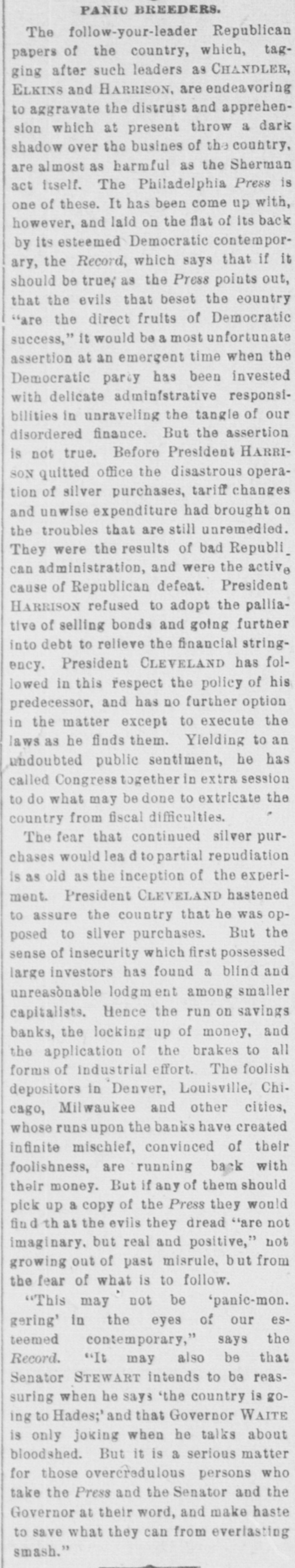 PANIO BREEDERS. The follow-your-leader Republican papers of the country, which, tagging after such leaders as CHANDLER, ELKINS and HARRISON, are endeavoring to aggravate the distrust and apprehension which at present throw a dark shadow over the busines of the country, are almost as harmful as the Sherman act itself. The Philadelphia Press is one of these. It has been come up with, however, and laid on the flat of its back by its esteemed Democratic contemporary, the Record, which says that if it should be true, as the Press points out, that the evils that beset the eountry "are the direct fruits of Democratic success," it would be a most unfortunate assertion at an emergent time when the Democratic party has been invested with delicate adminfstrative responsibilities in unraveling the tangle of our disordered finance. But the assertion is not true. Before President HARRISON quitted office the disastrous operation of silver purchases, tariff changes and unwise expenditure had brought on the troubles that are still unremedied. They were the results of bad Republi_ can administration, and were the active cause of Republican defeat. President HARRISON refused to adopt the palliative of selling bonds and going further into debt to relieve the financial stringency. President CLEVELAND has followed in this respect the policy of his predecessor, and has no further option in the matter except to execute the laws as he finds them. Yielding to an undoubted public sentiment, he has called Congress together in extra session to do what may be done to extricate the country from fiscal difficulties. The fear that continued silver purchases would lea d to partial repudiation is as old as the inception of the experiment. President CLEVELAND hastened to assure the country that he was opposed to silver purchases. But the sense of insecurity which first possessed large investors has found a blind and unreasònable lodgmen among smaller capitalists. Hence the run on savings banks, the locking up of money, and the application of the brakes to all forms of industrial effort. The foolish depositors in Denver, Louisville, Chicago, Milwaukee and other cities, whose runs upon the banks have created infinite mischief, convinced of their foolishness, are running back with their money. But if any of them should pick up a copy of the Press they would find th at the evils they dread "are not imaginary. but real and positive," not growing out of past misrule, but from the fear of what is to follow. "This may not be 'panic-mon. gering' in the eyes of our esteemed contemporary," says the Record. "It may also be that Senator STEWART intends to be reassuring when he says 'the country is going to Hades;' and that Governor WAITE is only joking when he talks about bloodshed. But it is a serious matter for those overcredulous persons who take the Press and the Senator and the Governor at their word, and make haste to save what they can from everlasting smash."