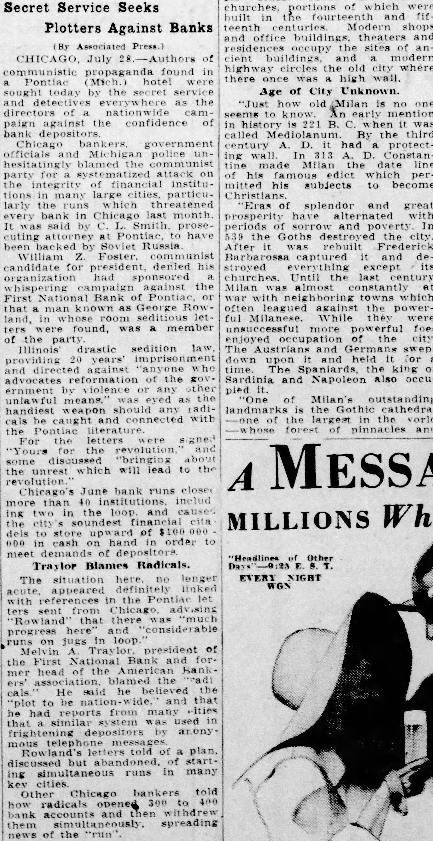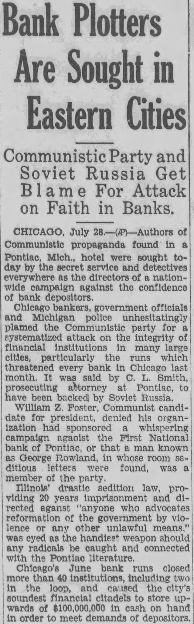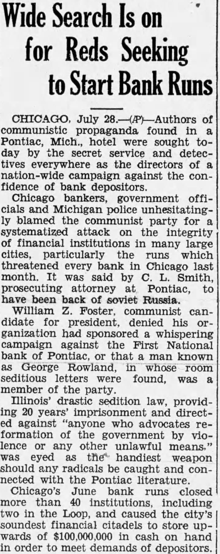 Secret Service Seeks Plotters Against Banks (By Associated Press.) July of propaganda found in hotel sought today the secret service and as of paign against the confidence of bank depositors government officials and police blamed communist for integrity financial institutions in many large larly the which threatened every bank in Chicago last month It said by Smith, prosecuting at Pontiac have by Soviet William Foster. communist candidate for president denied his had sponsored campaign against the First National Bank of Pontiac man George Row that land, in letwas member of the party drastic sedition law 20 years' and against reformation of the ernment violence was eyed handiest weapon should be and connected with the Pontiac For the letters "Yours and discussed "bringing about some will lead the the unrest which to Chicago's June bank runs 40 includ more ing two the the city soundest cita dels to store upward of $100 000 cash on hand in order in demands of Traylor Blames Radicals. The situation lenger EVERY NIGHT definitely references in the ters sent that there progress here on in loop runs jugs president of Melvin the First National Bank and head of the He he believed the and that "plot to be he had reports from many that similar system used in frightening told of plan. discussed but startruns in many ing key cities Other Chicago bankers told 300 how radicals bank accounts and then them spreading news of the "run