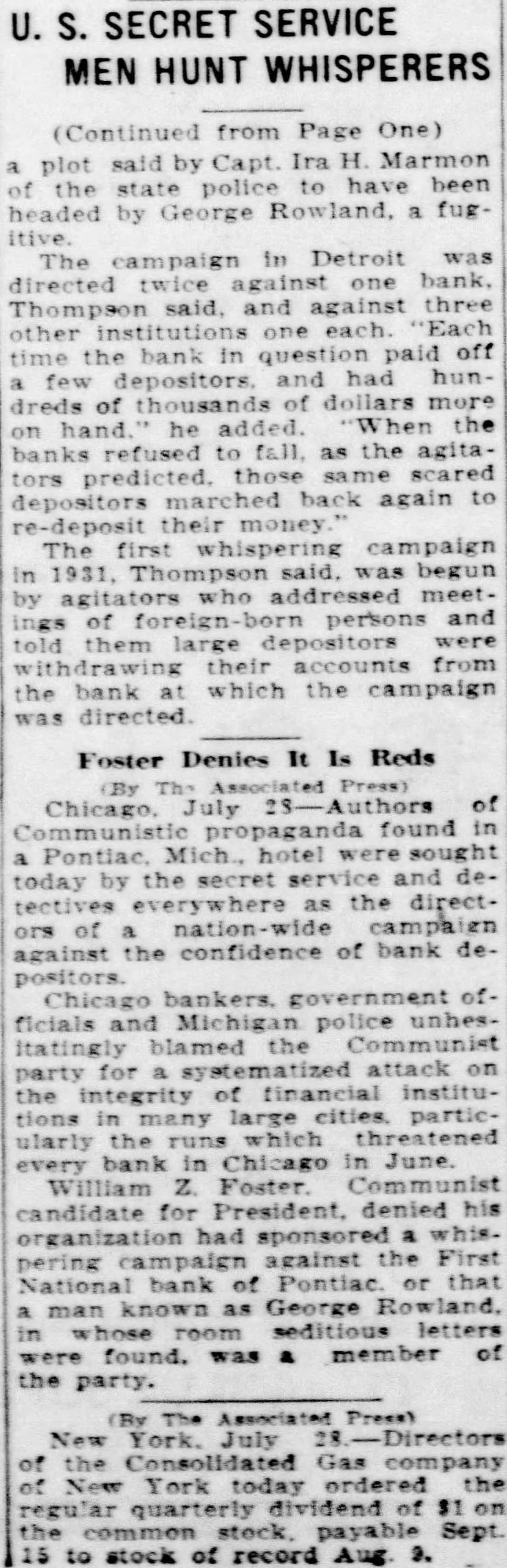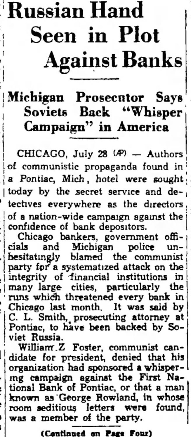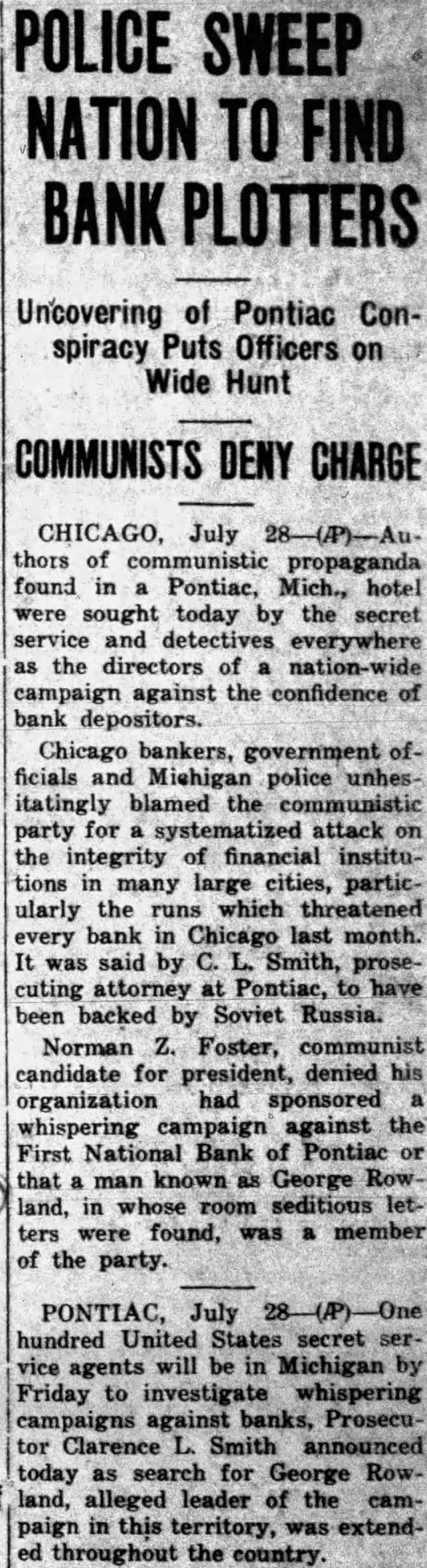 Secret Service Seeks Plotters Against Banks (By Associated Press.) July of propaganda found in hotel sought today the secret service and as of paign against the confidence of bank depositors government officials and police blamed communist for integrity financial institutions in many large larly the which threatened every bank in Chicago last month It said by Smith, prosecuting at Pontiac have by Soviet William Foster. communist candidate for president denied his had sponsored campaign against the First National Bank of Pontiac man George Row that land, in letwas member of the party drastic sedition law 20 years' and against reformation of the ernment violence was eyed handiest weapon should be and connected with the Pontiac For the letters "Yours and discussed "bringing about some will lead the the unrest which to Chicago's June bank runs 40 includ more ing two the the city soundest cita dels to store upward of $100 000 cash on hand in order in demands of Traylor Blames Radicals. The situation lenger EVERY NIGHT definitely references in the ters sent that there progress here on in loop runs jugs president of Melvin the First National Bank and head of the He he believed the and that "plot to be he had reports from many that similar system used in frightening told of plan. discussed but startruns in many ing key cities Other Chicago bankers told 300 how radicals bank accounts and then them spreading news of the "run