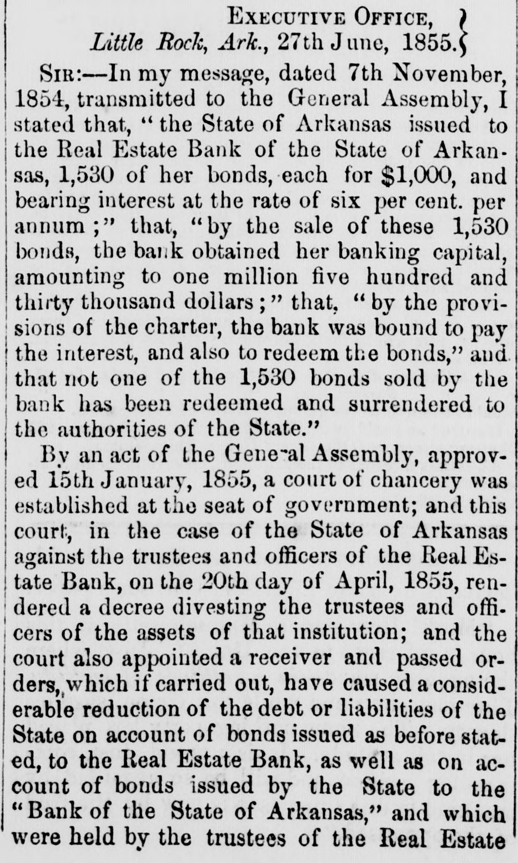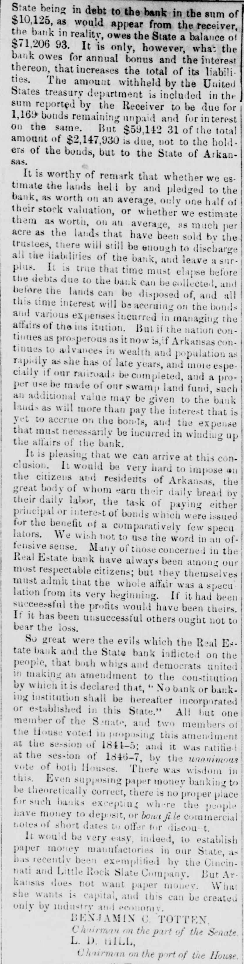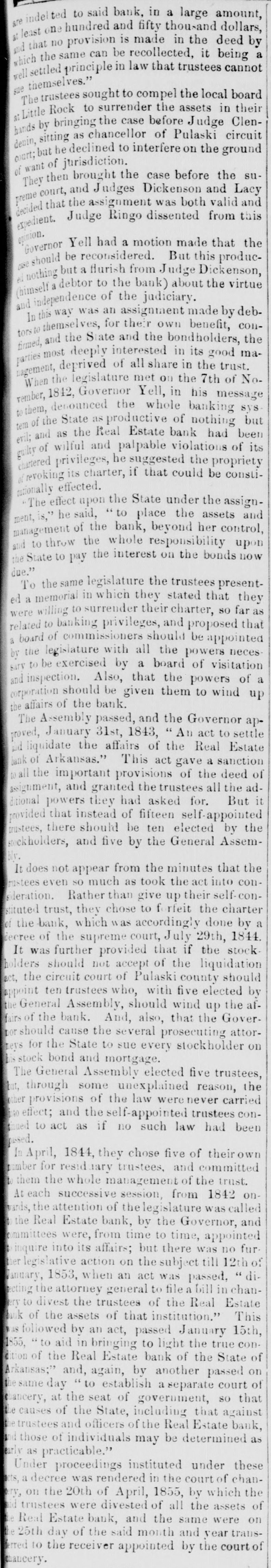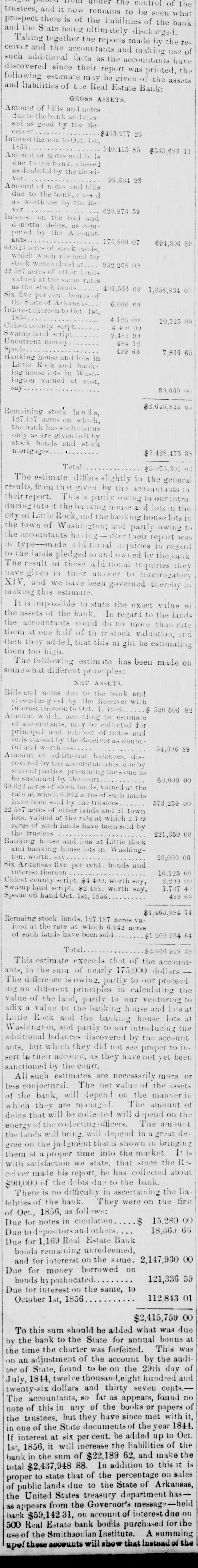 S to be seen what spect there is of the liabilities of the bank I the State being ultimately discharged. reTaking together the reports made by the er and the accountants and making use of h additional facts as the accountants have covered since their report was printed, the owing estimate may be given of the assets liabilities of the Real Estate Bank: GROSS ASSETS. ount of bills and notes ue to thebank andelas d us good by the Re $403,277 26 rest thereon Oct. 1st, 56 140.413 85 $545,693 ount of notes and bills the to the bank. classed . doubtful by the Recei99.684 28 ount of notes and bills ue to the bank, worthiess by the Re 420,876 59 rest on the bad and untria debts lited by the Account its 178.800 07 694,306 $ 23 acres of hich when ock were valued 00 952,268 87 aeres other lands alsed the rates the stock lands 496.566 00 1,858,834 € bon five percent State of 6,000 00 rest thereon to Oct 1st, 125 00 10,125 cot county serpt 4400.00 imp land script 2,482.90 arrent money 484 12 499 63 7,866 65 king house and lots in ittle Rock and bankg house lot= in Washgton valued at cost, y 80,000 $2,616,825 0 maining stock lands, .157 aeres on which, bank ha=such claims ly are giventoithy lock bonds and stock ortgages $2,428,475.89 Total $5,075,801 l'he estimate differs slightly in the general ults, from that given by the accountants 10 in report. This is partly owing to our intro ing into it the banking house and lots in the of Little Rock, and the banking house lots it town of Washington; and partly owing to accountants having-ifter report was type-mai additional inquiries in regard he lands pledged to and owned by the,bask e result of these additional inquiries they given in their answer to interrogatory V, and we have been governed thereby king this estimate t is impossible to state the exact value et assets of the bank. In regard to the lands accountants could do no more than rate m at one half of their stock valuation, and 11 they added, that this m ght be estimating m too high. 'he following estimate has been made on ewhat different principles: NET ASSETS. and notes due to the bank and used as g by the Receiver with iterest thereon to Oct. 8 520.506 82 ouat which. according to estimate accountants may be collected for rincipal and interest of notes and classed by the Receiver as doubt and worth 54,306 ount of additional balances, disvered by the accountan entparties presuming the same to sustained by thecourt 60,000 23 acres of stock lands, valued at the to at which 6,962 such lands we been sold by the trustees 578,259 57 acres of other lands and 21 town its. valued at the rate at which 2.109 res of such lauds have been sold by in trustees 221,350 00 king house and lots at Little Rock d banking house lots in Washingn. worth say 20,000 Arkan-a five per cent. bonds and iterest thereon 10.125 2,200.00 cot county script $4.400 worth may, 1,737 my land script, $2.482. worth say, 499 cie on hand Oct. 1st, 1856 $1,463,984 haing stock lands, 127 187 acres vaand at the rate at which 6.942 acres such lands have nsold $1.202.984.64 Total $2,666,919.35 This estimate exceeds that of the account. , in the sum of nearly 175,000 dollars.e difference is owing, partly to our proceed on different principles in calculating the ue of the land, partly to our venturing to X a value to the banking house and lots at tie Rock and the banking house lots at ashington, and partly to our introducing the itional balances discovered by the account s, but which they did not see proper to in. in their account, as they have not yet been ctioned by the court. All such estimates are necessarily more or conjectural. The net value of the assets the bank, will depend on the manner ich they are managed The amount of its that will be colie ted will depend on the rgy of the collecting officers. The amount lands will bring. will depend in great de e on the judgment thatis shown 10 bringing m at a proper time into the market It is h satisfaction we state. that since the Rever made his report, he has collected about 0,000 of the debts due to the bank. l'here is no difficulty in ascertaining the lia ties of the bank. They were on the first Oct., 1856, as follows: $ 15,280 00 e for notes in cieulation 18,360 6 e to depositors and others e for 1,169 Real Estate Bank onds remaining unredeemed, 2,147,930 0 and for intererst on the same. e for money borrowed on 121,336.59 onds hy pothocated. e for interest on the same, to 112,843 October 1st, 1856 $2,415,759 00 To this sum should be added what was due the bank to the State for annual bonus at time the charter was forfeited. This was an adjustment of the account by the audiof State, found to be on the 29th dav of y, 1844, twelve thousand,eight hundred and enty-six dollars and thirty seven cents.e accountants, so far as appears, found no e of this in any of the books or papers of trustees, but they have since met with it, the year 1844