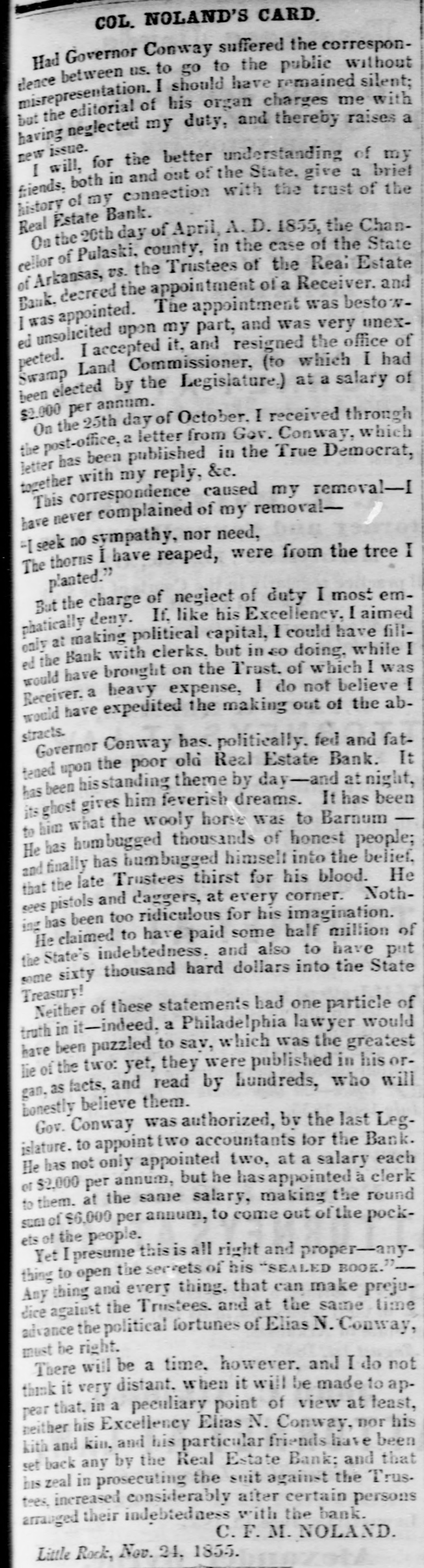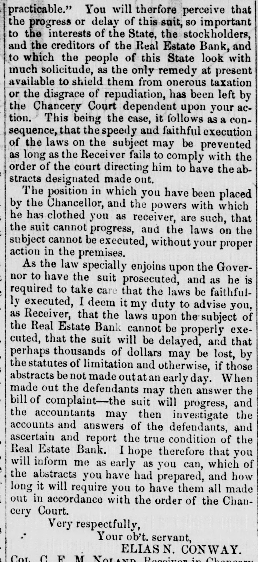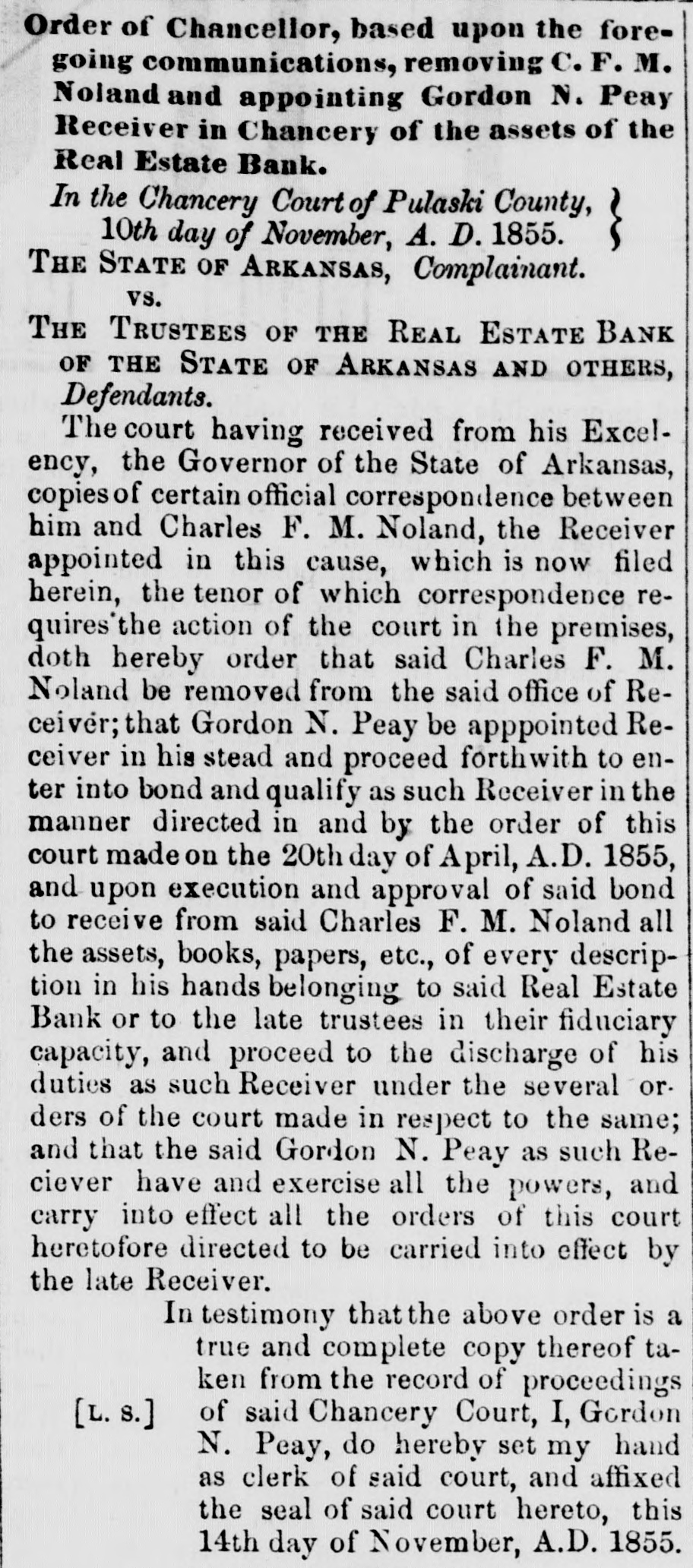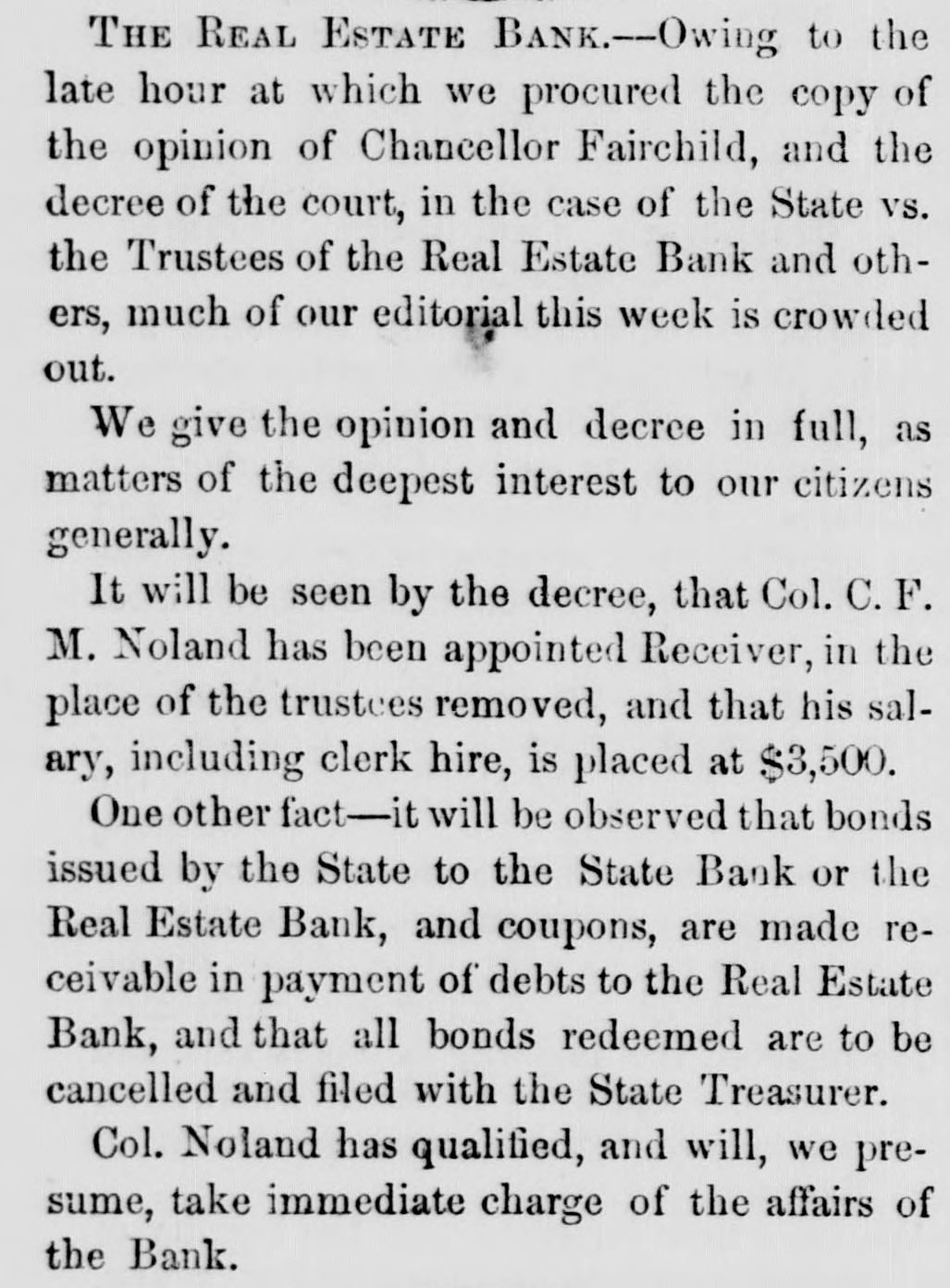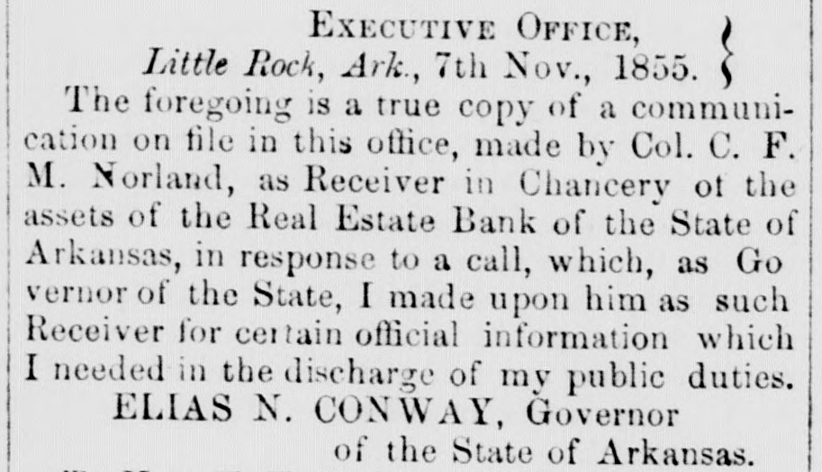 S to be seen what spect there is of the liabilities of the bank I the State being ultimately discharged. reTaking together the reports made by the er and the accountants and making use of h additional facts as the accountants have covered since their report was printed, the owing estimate may be given of the assets liabilities of the Real Estate Bank: GROSS ASSETS. ount of bills and notes ue to thebank andelas d us good by the Re $403,277 26 rest thereon Oct. 1st, 56 140.413 85 $545,693 ount of notes and bills the to the bank. classed . doubtful by the Recei99.684 28 ount of notes and bills ue to the bank, worthiess by the Re 420,876 59 rest on the bad and untria debts lited by the Account its 178.800 07 694,306 $ 23 acres of hich when ock were valued 00 952,268 87 aeres other lands alsed the rates the stock lands 496.566 00 1,858,834 € bon five percent State of 6,000 00 rest thereon to Oct 1st, 125 00 10,125 cot county serpt 4400.00 imp land script 2,482.90 arrent money 484 12 499 63 7,866 65 king house and lots in ittle Rock and bankg house lot= in Washgton valued at cost, y 80,000 $2,616,825 0 maining stock lands, .157 aeres on which, bank ha=such claims ly are giventoithy lock bonds and stock ortgages $2,428,475.89 Total $5,075,801 l'he estimate differs slightly in the general ults, from that given by the accountants 10 in report. This is partly owing to our intro ing into it the banking house and lots in the of Little Rock, and the banking house lots it town of Washington; and partly owing to accountants having-ifter report was type-mai additional inquiries in regard he lands pledged to and owned by the,bask e result of these additional inquiries they given in their answer to interrogatory V, and we have been governed thereby king this estimate t is impossible to state the exact value et assets of the bank. In regard to the lands accountants could do no more than rate m at one half of their stock valuation, and 11 they added, that this m ght be estimating m too high. 'he following estimate has been made on ewhat different principles: NET ASSETS. and notes due to the bank and used as g by the Receiver with iterest thereon to Oct. 8 520.506 82 ouat which. according to estimate accountants may be collected for rincipal and interest of notes and classed by the Receiver as doubt and worth 54,306 ount of additional balances, disvered by the accountan entparties presuming the same to sustained by thecourt 60,000 23 acres of stock lands, valued at the to at which 6,962 such lands we been sold by the trustees 578,259 57 acres of other lands and 21 town its. valued at the rate at which 2.109 res of such lauds have been sold by in trustees 221,350 00 king house and lots at Little Rock d banking house lots in Washingn. worth say 20,000 Arkan-a five per cent. bonds and iterest thereon 10.125 2,200.00 cot county script $4.400 worth may, 1,737 my land script, $2.482. worth say, 499 cie on hand Oct. 1st, 1856 $1,463,984 haing stock lands, 127 187 acres vaand at the rate at which 6.942 acres such lands have nsold $1.202.984.64 Total $2,666,919.35 This estimate exceeds that of the account. , in the sum of nearly 175,000 dollars.e difference is owing, partly to our proceed on different principles in calculating the ue of the land, partly to our venturing to X a value to the banking house and lots at tie Rock and the banking house lots at ashington, and partly to our introducing the itional balances discovered by the account s, but which they did not see proper to in. in their account, as they have not yet been ctioned by the court. All such estimates are necessarily more or conjectural. The net value of the assets the bank, will depend on the manner ich they are managed The amount of its that will be colie ted will depend on the rgy of the collecting officers. The amount lands will bring. will depend in great de e on the judgment thatis shown 10 bringing m at a proper time into the market It is h satisfaction we state. that since the Rever made his report, he has collected about 0,000 of the debts due to the bank. l'here is no difficulty in ascertaining the lia ties of the bank. They were on the first Oct., 1856, as follows: $ 15,280 00 e for notes in cieulation 18,360 6 e to depositors and others e for 1,169 Real Estate Bank onds remaining unredeemed, 2,147,930 0 and for intererst on the same. e for money borrowed on 121,336.59 onds hy pothocated. e for interest on the same, to 112,843 October 1st, 1856 $2,415,759 00 To this sum should be added what was due the bank to the State for annual bonus at time the charter was forfeited. This was an adjustment of the account by the audiof State, found to be on the 29th dav of y, 1844, twelve thousand,eight hundred and enty-six dollars and thirty seven cents.e accountants, so far as appears, found no e of this in any of the books or papers of trustees, but they have since met with it, the year 1844