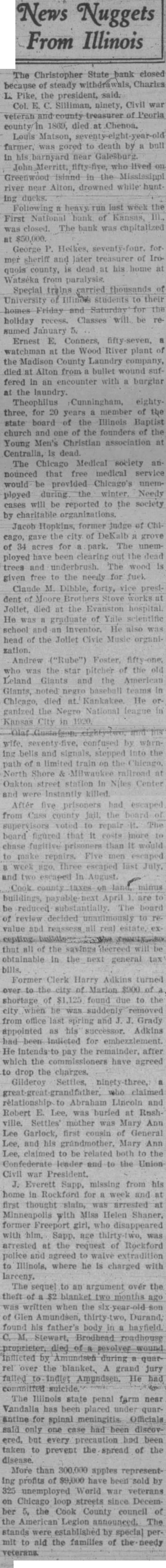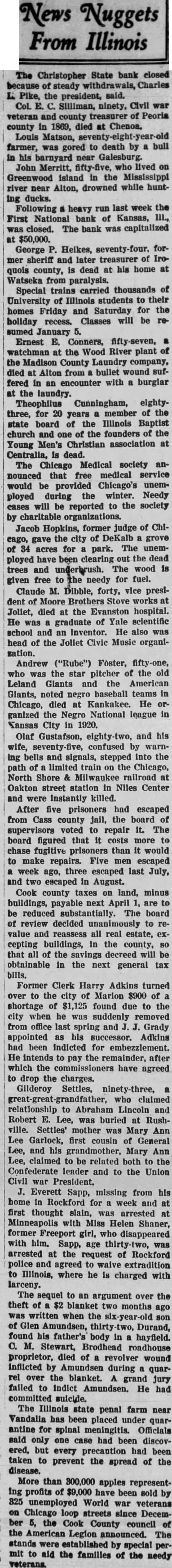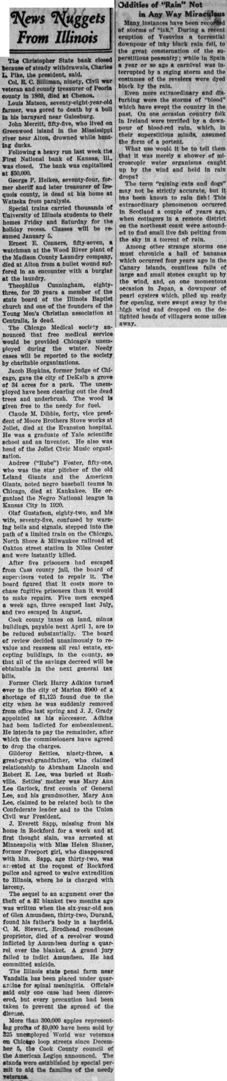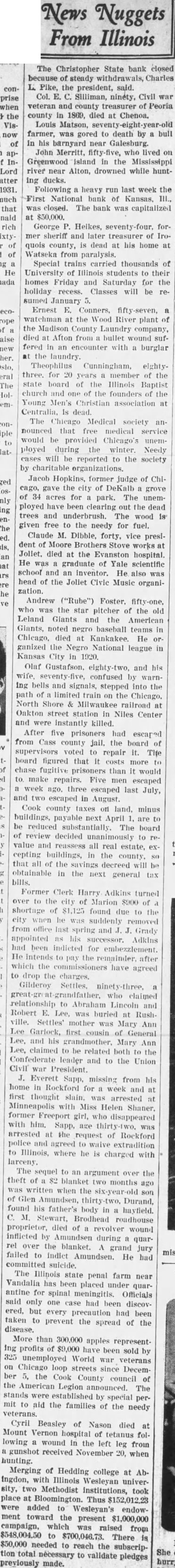 The Christopher State bank closed of steady Charles the president, said. Silliman, ninety, Civil war veteran and county treasurer of Peoria county 1869, died at Chenoa. Louis Matson, farmer, was gored to death his barnyard Galesburg. John Merritt, who Greenwood Island the Mississippi river near Alton, drowned while ing ducks. Following heavy run last week the First National bank of Kansas, closed. The bank was capitalized $50,000. George Heikes, former sheriff and later treasurer dead his home quois county, Watseka from paralysis. Special trains carried thousands of University of Illinois students their homes Friday and Saturday for the holiday recess. Classes will be sumed January Ernest E. Conners, watchman the Wood the Madison County Laundry company, died Alton from bullet wound suffered in encounter with burglar the laundry. Theophilus Cunningham, eightythree. for years member of the state board the Illinois Baptist church and one of the founders of the Young Men's Christian association Centralia, dead. The Chicago Medical society nounced that free medical service would be provided Chicago's unemduring the winter. Needy ployed cases will be reported to the society charitable organizations. Jacob Hopkins, former judge of Chithe of DeKalb grove acres for unemployed have been clearing the dead trees and underbrush. The wood free to the needy for fuel. given Claude Dibble, forty, vice prestdent of Moore Brothers Stove died the Evanston hospital. He graduate of Yale scientific was school and Inventor. He also was head the Joliet Civic Music organization. Andrew ("Rube") Foster, the star pitcher the who was Leland and the American noted baseball teams negro died at Kankakee. He Chicago, ganized the Negro National league Kansas City in 1920. Olaf Gustafson, and his confused warning bells and signals, stepped Into the path of limited train on the Chicago. North Shore Milwaukee railroad Oakton street station in Niles Center and were instantly killed. After five prisoners had escaped from Cass county jall, the board of supervisors voted to repair It. The board figured that It costs more chase fugitive prisoners than would to make repairs. men escaped week ago, three escaped last July, and escaped in August. Cook county taxes land, minus buildings, payable next be reduced substantially. board of review decided unanimously to value and reassess all real estate, buildings, in the cepting that all the savings decreed will be obtainable in the next general tax bills. Former Clerk Harry Adkins turned to the city of Marion $900 of $1,125 found due the shortage city when he was suddenly removed from office last spring and Grady successor. Adkins appointed had been indicted for embezzlement. He intends pay the which the commissioners have agreed drop the charges. Gilderoy Settles, who claimed relationship Abraham Lincoln and Robert Lee, was burled Rushville. Settles' mother was Mary Ann Lee Garlock, first cousin of General and his grandmother, Mary Ann Lee, claimed be related both to the Confederate leader and to the Union Civil President. Everett missing from his Sapp, home Rockford for week and first thought slain, was arrested Minneapolis with Miss Helen Shaner, former Freeport girl," disappeared with him. Sapp, age was arrested the request of Rockford police and agreed to walve extradition Illinois, where he is charged with larceny. The sequel to an argument over the theft blanket months was written when the six-year-old son of Glen Amundsen, Durand, found his father's body hayfield. Stewart, Brodhead roadhouse died of revolver wound proprietor, inflicted Amundsen during quarthe blanket. grand jury failed to indiet Amundsen. He had committed suicide. The Illinois state penal farm near Vandalia has been placed under quarantine for spinal meningitis. Officials said only one case had been discovered, but every precaution had been taken to prevent the spread the disease. More than 300,000 apples representing profits $9,000 have been sold unemployed World war veterans Chicago streets since Decemloop ber the Cook County council the American Legion announced. stands were special mit to aid the families the needy