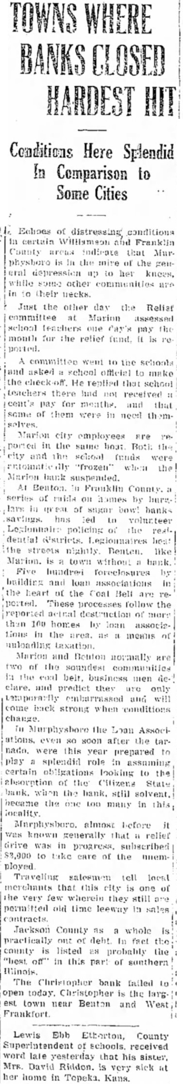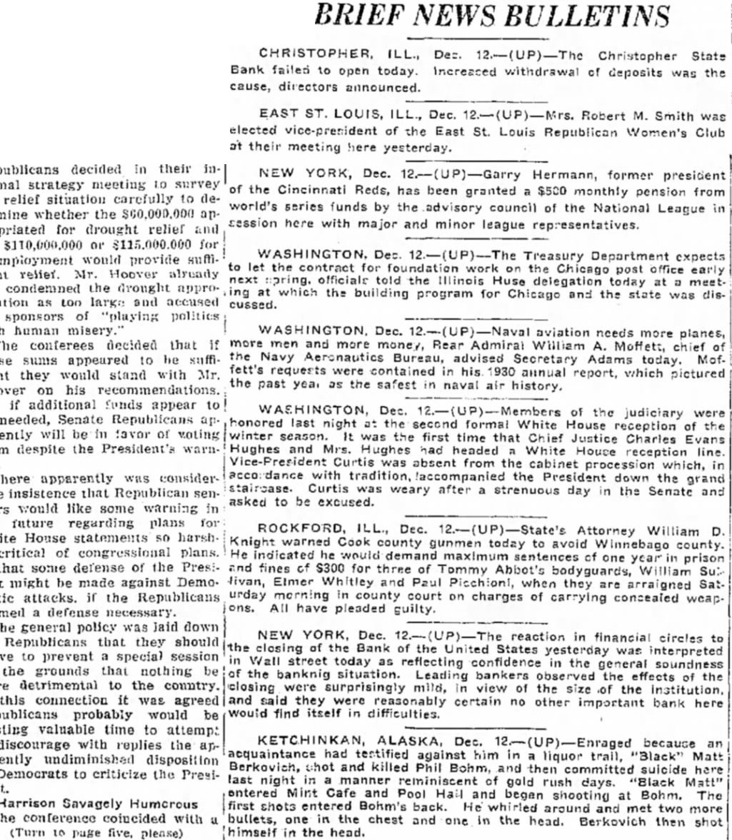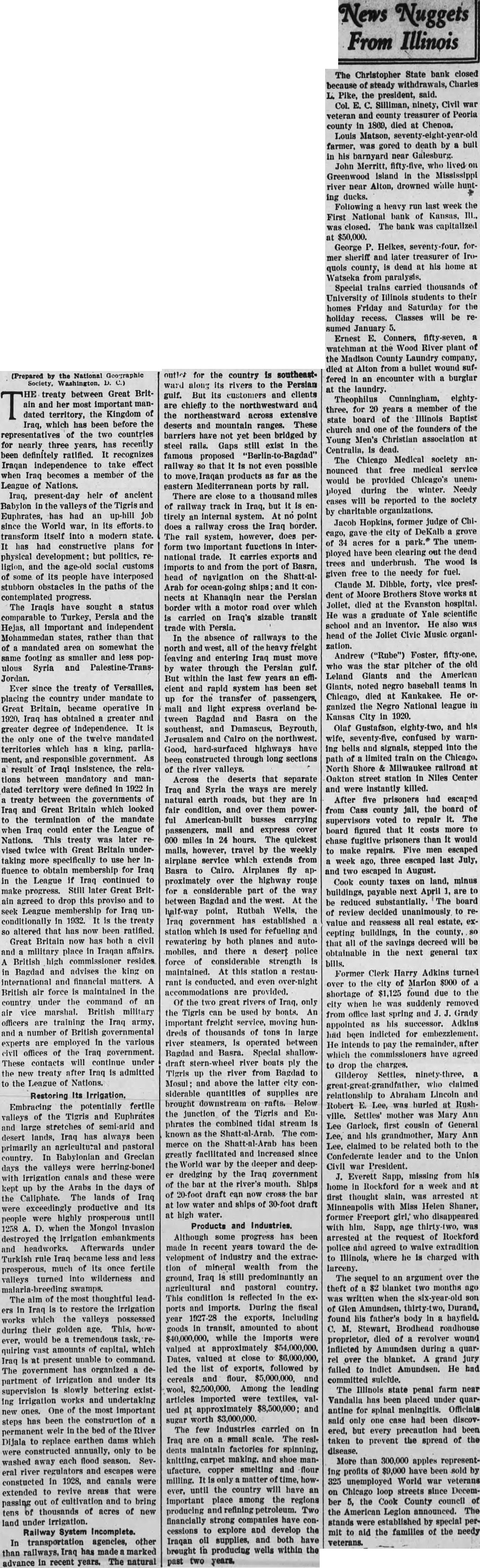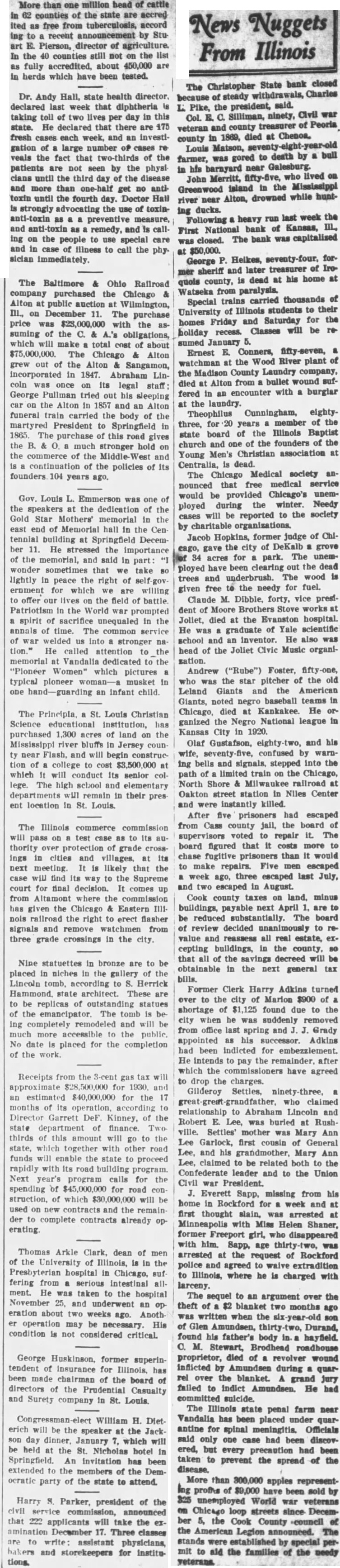 The Christopher State bank closed of steady Charles the president, said. Silliman, ninety, Civil war veteran and county treasurer of Peoria county 1869, died at Chenoa. Louis Matson, farmer, was gored to death his barnyard Galesburg. John Merritt, who Greenwood Island the Mississippi river near Alton, drowned while ing ducks. Following heavy run last week the First National bank of Kansas, closed. The bank was capitalized $50,000. George Heikes, former sheriff and later treasurer dead his home quois county, Watseka from paralysis. Special trains carried thousands of University of Illinois students their homes Friday and Saturday for the holiday recess. Classes will be sumed January Ernest E. Conners, watchman the Wood the Madison County Laundry company, died Alton from bullet wound suffered in encounter with burglar the laundry. Theophilus Cunningham, eightythree. for years member of the state board the Illinois Baptist church and one of the founders of the Young Men's Christian association Centralia, dead. The Chicago Medical society nounced that free medical service would be provided Chicago's unemduring the winter. Needy ployed cases will be reported to the society charitable organizations. Jacob Hopkins, former judge of Chithe of DeKalb grove acres for unemployed have been clearing the dead trees and underbrush. The wood free to the needy for fuel. given Claude Dibble, forty, vice prestdent of Moore Brothers Stove died the Evanston hospital. He graduate of Yale scientific was school and Inventor. He also was head the Joliet Civic Music organization. Andrew ("Rube") Foster, the star pitcher the who was Leland and the American noted baseball teams negro died at Kankakee. He Chicago, ganized the Negro National league Kansas City in 1920. Olaf Gustafson, and his confused warning bells and signals, stepped Into the path of limited train on the Chicago. North Shore Milwaukee railroad Oakton street station in Niles Center and were instantly killed. After five prisoners had escaped from Cass county jall, the board of supervisors voted to repair It. The board figured that It costs more chase fugitive prisoners than would to make repairs. men escaped week ago, three escaped last July, and escaped in August. Cook county taxes land, minus buildings, payable next be reduced substantially. board of review decided unanimously to value and reassess all real estate, buildings, in the cepting that all the savings decreed will be obtainable in the next general tax bills. Former Clerk Harry Adkins turned to the city of Marion $900 of $1,125 found due the shortage city when he was suddenly removed from office last spring and Grady successor. Adkins appointed had been indicted for embezzlement. He intends pay the which the commissioners have agreed drop the charges. Gilderoy Settles, who claimed relationship Abraham Lincoln and Robert Lee, was burled Rushville. Settles' mother was Mary Ann Lee Garlock, first cousin of General and his grandmother, Mary Ann Lee, claimed be related both to the Confederate leader and to the Union Civil President. Everett missing from his Sapp, home Rockford for week and first thought slain, was arrested Minneapolis with Miss Helen Shaner, former Freeport girl," disappeared with him. Sapp, age was arrested the request of Rockford police and agreed to walve extradition Illinois, where he is charged with larceny. The sequel to an argument over the theft blanket months was written when the six-year-old son of Glen Amundsen, Durand, found his father's body hayfield. Stewart, Brodhead roadhouse died of revolver wound proprietor, inflicted Amundsen during quarthe blanket. grand jury failed to indiet Amundsen. He had committed suicide. The Illinois state penal farm near Vandalia has been placed under quarantine for spinal meningitis. Officials said only one case had been discovered, but every precaution had been taken to prevent the spread the disease. More than 300,000 apples representing profits $9,000 have been sold unemployed World war veterans Chicago streets since Decemloop ber the Cook County council the American Legion announced. stands were special mit to aid the families the needy