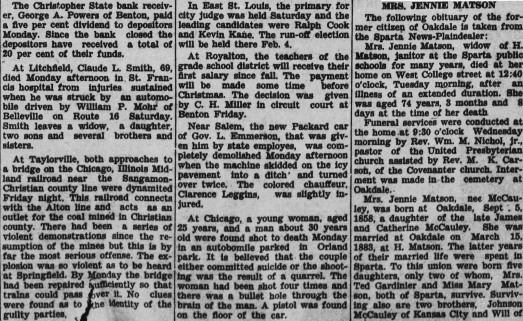 The Christopher State bank receiver, George A. Powers of Benton, paid a five per cent dividend to depositors Monday. Since the bank closed the depositors have received a total of 20 per cent of their funds. At Litchfield, Claude L. Smith, 69, died Monday afternoon in St. Francis hospital from injuries sustained when he was struck by an automobile driven by William P. Mohr of Belleville on Route 16 Saturday. Smith leaves a widow, daughter, two sons and several brothers and sisters. At Taylorville, both approaches to a bridge on the Chicago, Illinois Midland railroad near the SangamonChristian county line were dynamited Friday night. This railroad connects with the Alton line and acts as an outlet for the coal mined in Christian county. There had been a series of violent demonstrations since the resumption of the mines but this is by far the most serious offense. The explosion was so violent as to be heard at Springfield. By Monday the bridge had been repaired Aufficiently so that trains could pass over No clues were found as to the identity of the guilty parties. In East St. Louis, the primary for city judge was held Saturday and the leading candidates were Ralph Cook and Kevin Kane. The run-off election will be held there Feb. 4. At Royalton, the teachers of the grade school district will receive their first salary since fall. The payment will be made some time before Christmas. The decision was given by C. H. Miller in circuit court at Benton Friday. Near Salem, the new Packard car of Gov. L. Emmerson, that was given him by state employes, was completely demolished Monday afternoon when the machine skidded on the icy pavement into a ditch and turned over twice. The colored chauffeur, Clarence Leggins, was slightly injured. At Chicago, a young woman, aged 25 years, and man about 30 years old were found shot to death Monday in an autobomile parked in Orland park. It is believed that the couple either commit suicide or the shooting was the result of a quarrel. The woman had been shot four times and there was a bullet hole through the brain of the man. A pistol was found on the floor of the car. MRS. JENNIE MATSON The following obituary of the former citizen of Oakdale is taken from the Sparta News-Plaindealer: Mrs. Jennie Matson, widow of H. Matson, janitor at the Sparta public schools for many years, died at her home on West College street at 12:40 o'clock, Tuesday morning, after an illness of an extended duration. She was aged 74 years, 3 months and 8 days at the time of her death Funeral services were conducted at the home at 9:30 o'clock Wednesday morning by Rev. Wm. M. Nichol, Jr., pastor of the United Presbyterian church assisted by Rev. M. K. Carson, of the Covenanter church. Interment was made in the cemetery at Oakdale. Mrs. Jennie Matson, nee McCauley, was born at Oakdale, Sept 5, 1858, a daughter of the late James and Catherine McCauley. She was married at Oakdale on March 15, 1883, at H. Matson. The latter years of their married life were spent in Sparta. To this union were born five daughters, only two of whom, Mrs. Ted Gardinier and Miss Mary Matson, both of Sparta, survive. Surviving also are two brothers, Johnson McCauley of Kansas City and Will of