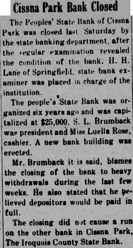 Cissna Park Bank Closed The Peoples' State Bank of Cissna Park was closed last Saturday by the state banking department. after the regular examination revealed the condition of the bank. H. H. Lane of Springfield, state bank examiner was placed in charge of the The people's State Bank was or. ganized six years ago and was capitalized at $25,000. S. L. Brumback was president and Miss Luella Rose, cashier. A new bank building was erected. Mr. Brumback it is said, blames the closing of the bank to heavy withdrawals during the last few weeks. He also stated that he pelieved depositors would be paid in full. The closing did not cause a run on the other bank in Cisena Park, The Iroquois County State Bank.