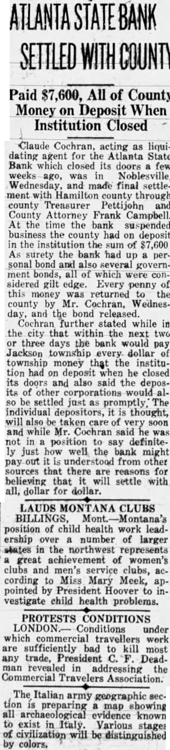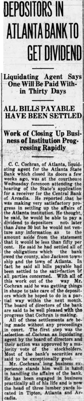 The State Bank of Atlanta, the third small financial the county to close its doors the past three weeks, not open morning for the transaction of which business, surprise business circles and among depositors of the bank the county. The officers of the institution follows: Bishop. Scully. Walton. Assistant Plain. None them could located long distance telephone Wednesday morning far known none the officials have given out any statement but that the trouble with the bank largely the result of continued withdrawals and failure realize some of the assets which held. said the closing of the Central Bank Arcadia, ten days ago, creased the from the Atlanta institution without the posits showing any material crease. known that the bank has farm on which could not and this situation made matters rather for ready money. was Wednesday morning that the State Banking Department would check up on the institution and allow the directors to make effort reorganize they felt disposed so take any other step which might help the institution community. The last official statement to the condition of this bank was published March of the present year and showed loans and discounts to the amount with bonds and the amount of and on hands. The furniture and fixtures the bank were listed at $4,350 and the banking house $15,600. The entire given The capital stock demand deposits the savings deposits and demand with surplus of $6,000. The present organization has been existence about fifteen years, the reorganization taking place soon after the death Walton, who the bank number of years owned large part of stock. The iginal bank was started by Walton, father of Ed and Shirl Walton and one of the pioneer business men of the northern part of the county Within the past few weeks the Central Bank Arcadia has closed doors the Fishers Bank was taken over the Citizens State Bank, of this city. Otto Jensen, trustee of Jackson township, who the city, said the township funds were tied the Atlanta bank and also the Central Bank Arcadia. He said he thought would be able to pay the school bills for their past month, but he did not know exacthow things would out until he took an invoice cash.