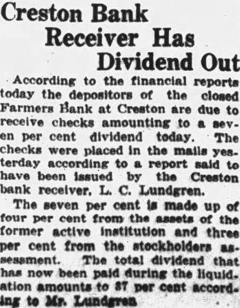 Creston Bank Has Out According the financial reports today the depositors of the closed Farmers Bank at Creston are due to receive checks amounting to cent dividend The checks placed in the mails terday according report said have been issued Creston bank Lundgren. The seven per cent made of cent the former active and three per cent from the stockholders The total dividend has been paid during the liquid. amounts per cent ing to Mr.