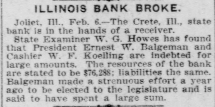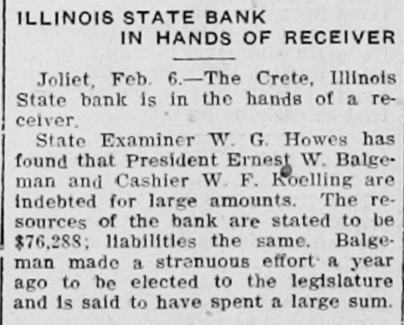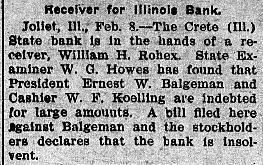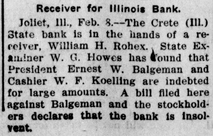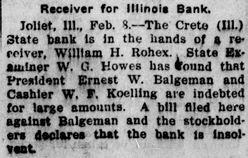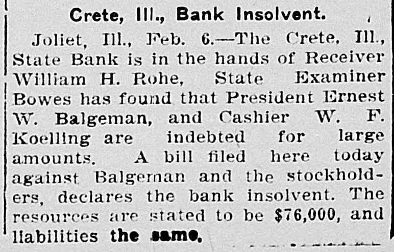 Crete, III., Bank Insolvent. Joliet, Ill., Feb. 6.-The Crete. Ill., State Bank is in the hands of Receiver William H. Rohe, State Examiner Bowes has found that President Ernest W. Balgeman, and Cashier W. F. Koelling are indebted for large amounts. A bill filed here today against Balgeman and the stockholders, declares the bank insolvent. The resources are stated to be $76,000, and liabilities the same.