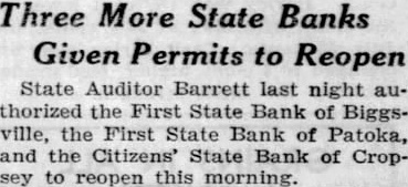 State Auditor Barrett last night thorized the First State Bank Biggsville, the First Bank Patoka, and Citizens' State Bank of Cropsey to reopen this morning.