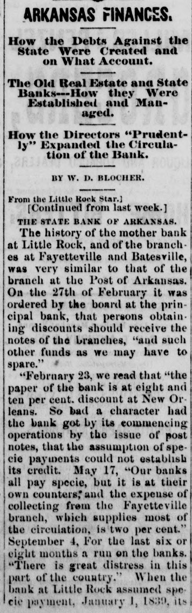 ARKANSAS FINANCES. How the Debts Against the State Were Created and on What Account. The Old Real Estate and State Banks---How they Were Established and Managed. How the Directors "Prudently" Expanded the Circulation of the Bank. -BY W. D. BLOCHER. From the Little Rock Star.] [Continued from last week.] THE STATE BANK OF ARKANSAS. The history of the mother bank at Little Rock, and of the branches at Fayetteville and Batesville, was very similar to that of the branch at the Post of Arkansas. On the 27th of February it was ordered by the board at the principal bank, that persons obtain ing discounts should receive the notes of the branches, "and such other funds as we may have to spare." "February 23, we read that "the paper of the bank is at eight and ten per cent. discount at New Orleans. So bad a character had the bank got by its commencing operations by the issue of post notes, that the assumption of specie payments could not establish its credit. May 17, "Our banks all pay specie, but it is at their own counters; and the expense of collecting from the Fayetteville branch, which supplies most of the circulation, is two per cent." September 4, For the last six or eight months a run on the banks. "There is great distress in this part of the country." When the bank at Little Rock assumed specie payment, January 1, 1839, its