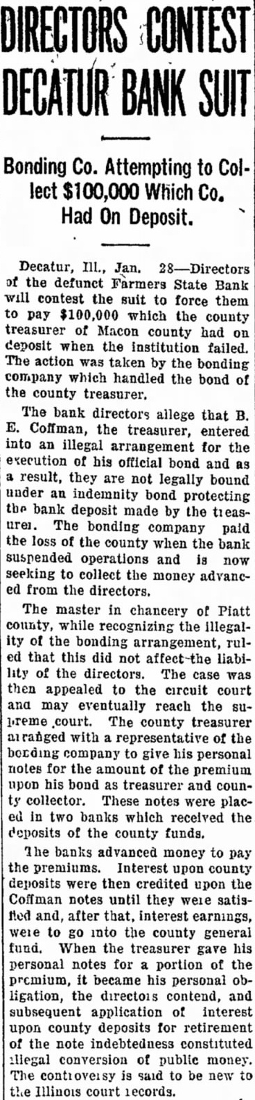 DIRECTORS CONTEST DECATUR BANK SUIT Bonding Co. Attempting to Collect $100,000 Which Co. Had On Deposit. Decatur, III., Jan. 28-Directors of the defunct Farmers State Bank will contest the suit to force them to pay $100,000 which the county treasurer of Macon county had on deposit when the institution failed. The action was taken by the bonding company which handled the bond of the county treasurer. The bank directors allege that B. E. Coffman, the treasurer, entered into an illegal arrangement for the execution of his official bond and as a result, they are not legally bound under an indemnity bond protecting the bank deposit made by the treasurei. The bonding company paid the loss of the county when the bank suspended operations and is now seeking to collect the money advanced from the directors. The master in chancery of Piatt county, while recognizing the illegality of the bonding arrangement, ruled that this did not affect-the liability of the directors. The case was then appealed to the circuit court and may eventually reach the supreme court. The county treasurer airanged with a representative of the bording company to give his personal notes for the amount of the premium upon his bond as treasurer and county collector. These notes were placed in two banks which received the deposits of the county funds. The banks advanced money to pay the premiums. Interest upon county deposits were then credited upon the Coffman notes until they were satisfled and, after that, interest earnings, were to go into the county general fund. When the treasurer gave his personal notes for a portion of the premium, it became his personal obligation, the directors contend, and subsequent application of interest upon county deposits for retirement of the note indebtedness constituted illegal conversion of public money. The controversy is said to be new to the Illinois court ecords.