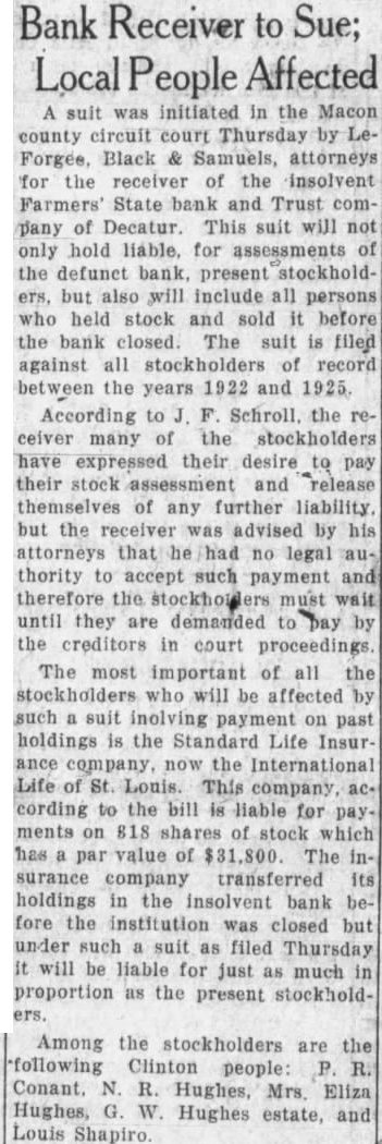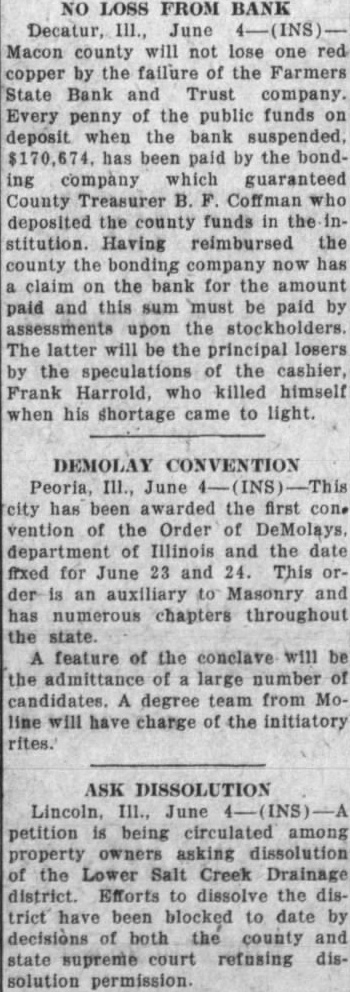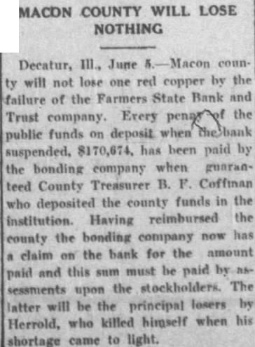 Decatur, III., June 5.-Macon county will not lose one red copper by the failure of the Farmers State bank and Trust company. Every penny of the public funds on deposit when the bank suspended, $170,674, has been paid by the bonding company which guaranteed County Treasurer B. F. Coffman, who deposited the county funds in the institution. Having reimbursed the county, the bonding company now has a claim on the bank for the amount paid and this sum must be paid by assessments upon principal losers by the speculations of the stockholders. The latter will be the cashier, Frank Herrold, who killed himself when his shortage came to light.