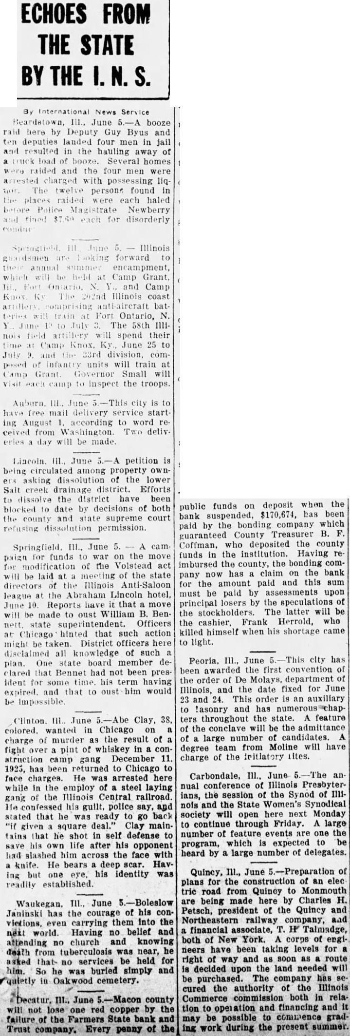 Clinton. III. June 5.-Abe Clay, 38, colored. wanted in Chicago on a charge of murder as the result of a fight over pint of whiskey in a construction camp gang December 11. 1925, has been returned to Chicago to face charges. He was arrested here while in the employ of a steel laying gang of the Illinois Central railroad. He confessed his guilt, police say, and stated that he was ready to go back "if given square deal." Clay maintains that he shot in self defense to save his own life after his opponent had slashed him across the face with knife. He bears deep scar. Having but one eye. his identity was readily established.