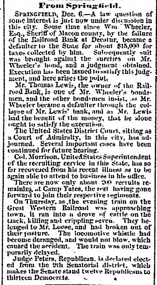 From Springtield. SPRINGFIELD, Dec. 6.-A law question of some interest is just now under discussion in this city. Some time since Wm Wheeler, Esq., Sheriff of Macon county, by the failure of the Railroad Bank at Decatur, became a defaulter to the State for about $15,000 for taxes collected by him. Subsequently suit was brought against the sureties on Mr. Wheeler's bond, and a judgment obtained. Execution has been issued to satisfy this judgment, and here arises the polut, Mr. Thomas Lewis, the owner of the Railroad Bank, is one of Mr. Wheeler's bondsmen. and the other bond-men insist, as Mr. Wheeler became a defaulter through the collapse of Mr. Lewis' bank, and as Mr. Lewis had the benefit of the money, that he alone onght to sati-fy the execution. The United States District Court. sitting as :4 Court of Admiralty, in this city, has adjourned. Several important cases have been continued for future hearing. Col. Morrison. UnitedStates Superintendent of the recruiting service in this State, has so far recovered from his recent illuess as to be again able to attend to business in his office. There are now only about 200 recruits remaining at Camp Yates, the THE having gone forward to join their respective regiments. On Thursday, as the evening train on the Great Western Railroad was approaching town. it ran into a drove of cattle on the taack, killing and crippling seven. They helonged to Mr. Loose, and had broken out of their pasture. The locomotive whistle had become deranged, and would not blow. which caused the accident. The train was only temporarily delayed. Judge Peters. Republican. is declared elected from the 9th Senatorial district, which makes the Senate stand twelve Republicans to thirteen Democrats.