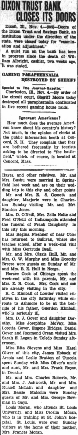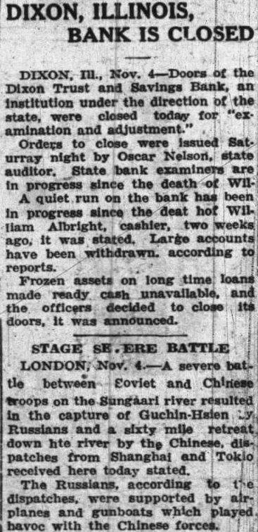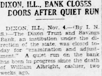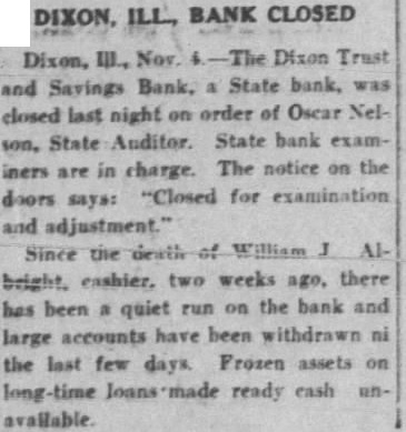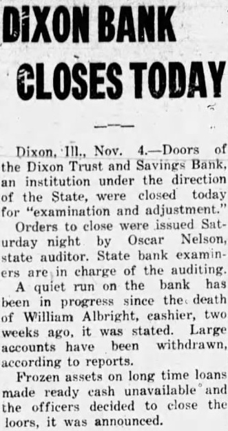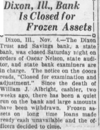 DIXON TRUST AND SAVINGS BANK CLOSED QUIET RUN ON DIXON BANKING INSTITUTION FOLLOWED BY CLOSING OF DOORS BY STATE BANK EXAMINERS FROZEN ASSETS ON LONG TIME LOANS BLAMED. Doors of the Dixon Trust and Savings bank. an institution under the direction of the state. were closed today for, "examination and adjustment. Orders to close were issued on Saturday night by Oscar Nelson. state auditor. State bank examiners are in charge of the audit quiet run on the bank has been in progress since the death of William Albright, cashier. two weeks ago, it was stated. Large accounts have been withdrawn. according to reports. Frozen assets on long time loans made ready cash unavailable and the officers decided to close the doors, it was announced. Close Chicago Bank The City State bank of Chicago of which Cornellus R. Miller, well known to many Belvidere people, is president, was closed by state bank examiners last Saturday. Mr. Miller was former director of public works under Gov, Len Small. The bank was closed on orders of State Auditor Oscar Nelson after examiners had announced a frozen condition of a portion of its assets. Officials of the bank declared that depositors will receive 100 cents on the dollar "The last quarterly statement of the bank as of Oct. showed resources of $4 670.519 and deposits of $3,922,530. The bank was capitalized at $400,000 and had a surplus of $200,000. It was not a member of the Chicago Clearing house asThere had been a virtual run on the bank during the recent sag of the stock market.