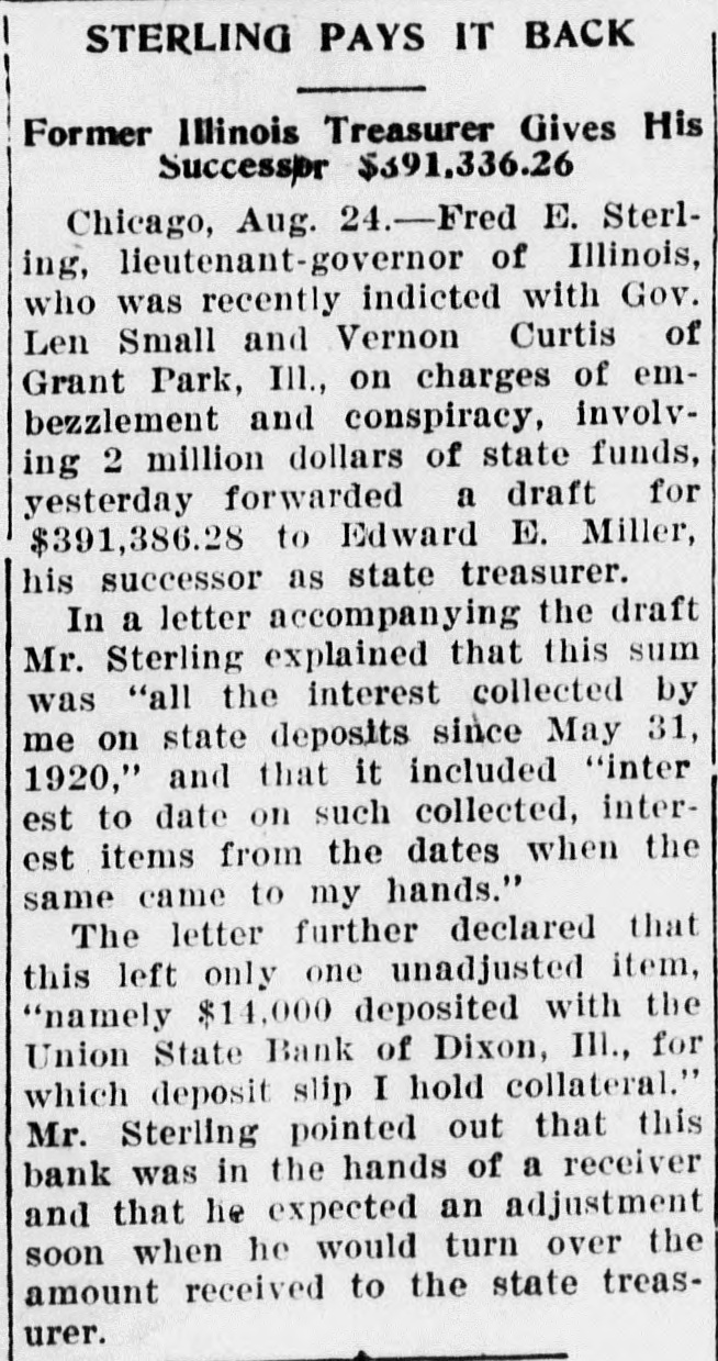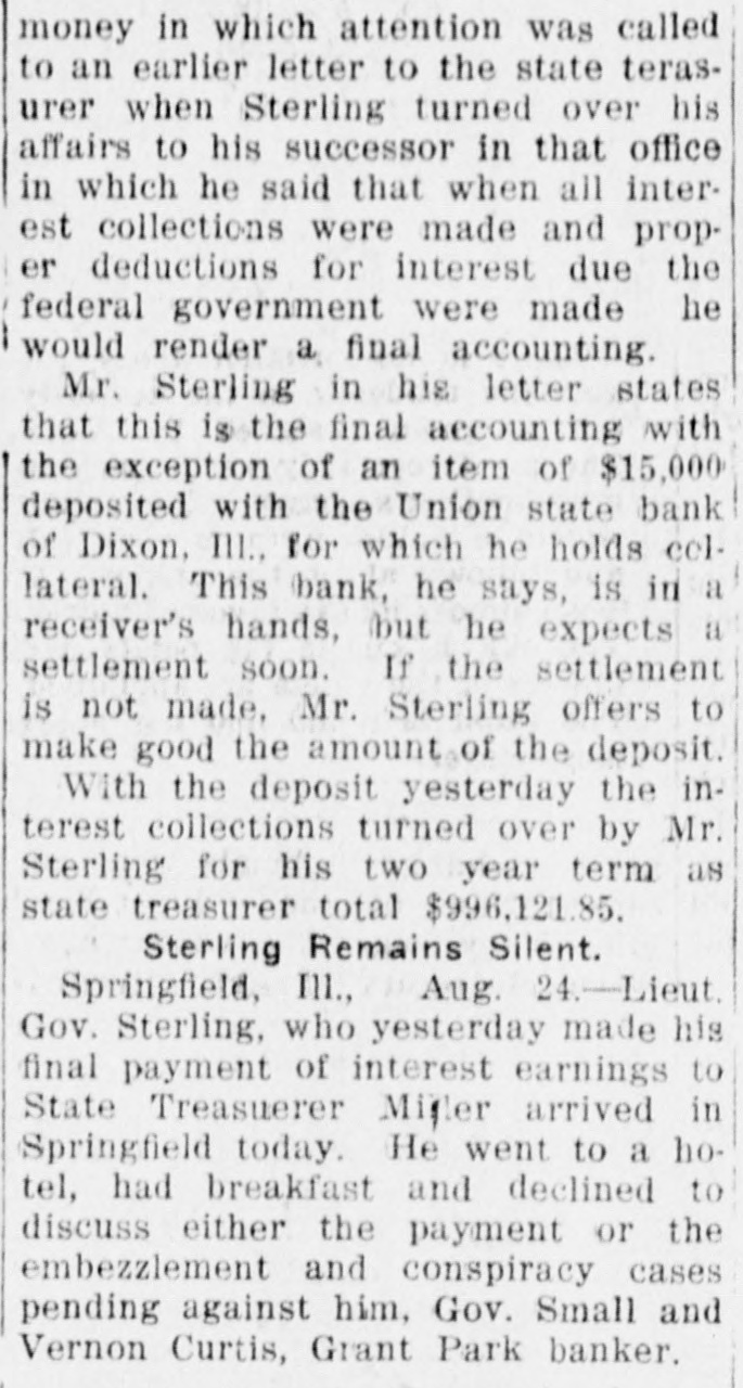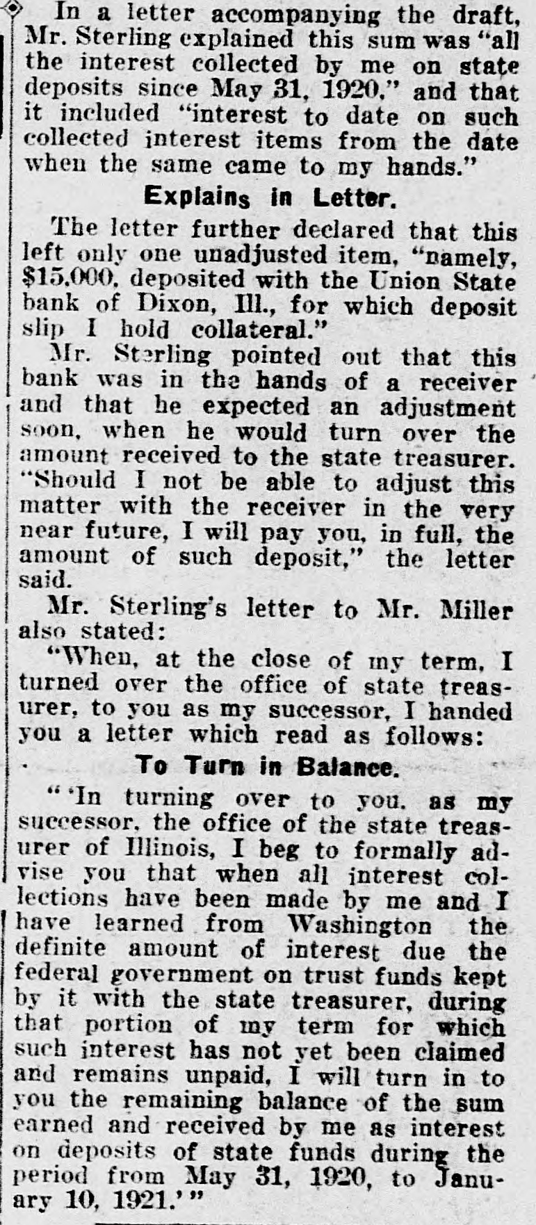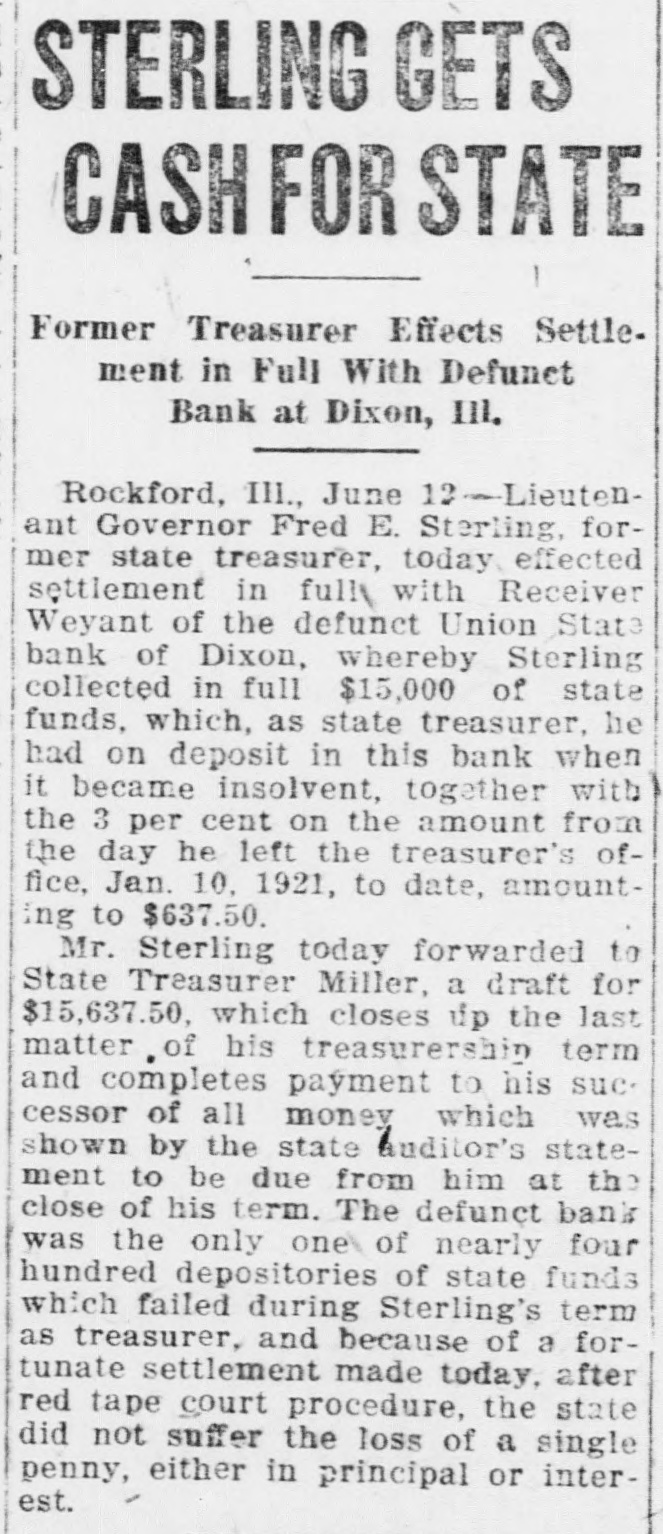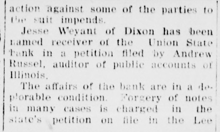 (Continued on Page Four). ASSESS STOCK OF DIXON BANK Seek Dissolution of Union State by Court Process-Notes Alleged to Be Forgeries. Dixon, Ill., Nov. 30.-The bill of complaint filed in the Lee county circuit court in behalf of the state of Illinois and Andrew Russel, auditor of public accounts, asking the dissolution of the Union State bank of Dixon, which was closed two weeks ago, charges that the liabilities of the bank are so much in excess of the resources of the bank that an assessment upon the stockholders will be necessary to pay all indebtedness to depositors, and further charges on information and belief that a large amount of the promissory notes appearing among the resources are forgeries. The bill charges "that among the resources appear certain promissory notes executed by, or the payment thereof assumed by E. J. Countryman, former cashier of said banking corporation, in excess of $130,000 at least $100,000 of which your orators believe to be worthless and uncollectable, the greater part of which are the forged notes of said E. J. Countryman." The report states the resources of the bank are so depreciated that they are worth at least $136,000 less than the total liabilities. Deposits in the bank were $408.171.72. In Lee county circuit court yesterday, Judge F. D. Stransky confirmed the appointment of J. U. Weyandt as receiver and named Harry Warner, John P. Devine and E. E. Wingert attorneys for the receiver.