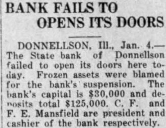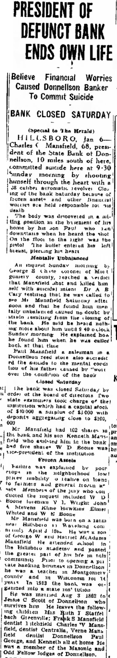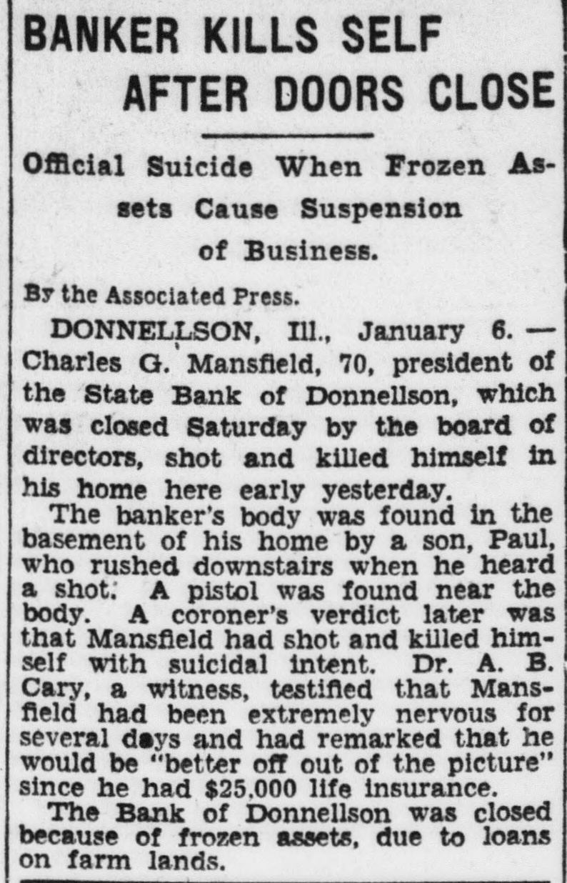 BANKER KILLS SELF AFTER DOORS CLOSE Official Suicide When Frozen Assets Cause Suspension of Business. By the Associated Press. DONNELLSON, Ill., January 6. Charles G. Mansfield, 70, president of the State Bank of Donnellson, which was closed Saturday by the board of directors, shot and killed himself in his home here early yesterday. The banker's body was found in the basement of his home by a son, Paul, who rushed downstairs when he heard a shot: A pistol was found near the body. A coroner's verdict later was that Mansfield had shot and killed himself with suicidal intent. Dr. A. B. Cary, a witness, testified that Mansfield had been extremely nervous for several days and had remarked that he would be "better off out of the picture" since he had $25,000 life insurance. The Bank of Donnellson was closed because of frozen assets, due to loans on farm lands.