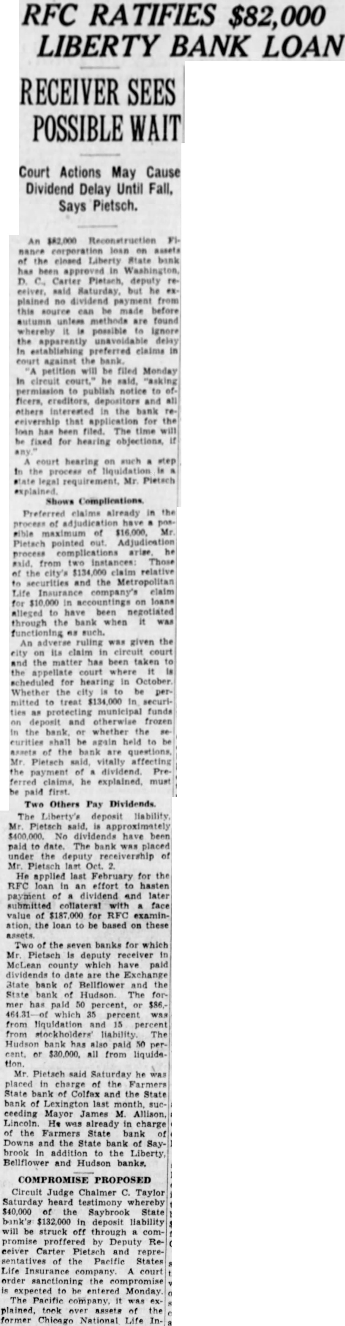 RFC RATIFIES $82,000 LIBERTY BANK LOAN RECEIVER SEES POSSIBLE WAIT Court Actions May Cause Dividend Delay Until Fall, Says Pietsch. An $82,000 nance corporation loan on of the closed Liberty State bank has been approved in Washington, D. Carter deputy said but he plained no dividend payment from this source can be made before autumn unless methods are found whereby possible to the apparently unavoidable delay In establishing preferred claims in court against the bank. "A petition will be filed Monday circuit court," he to publish notice to depositors and all others interested in the bank that application for the loan has been filed. The time will be fixed for hearing objections, court hearing on such step the process of liquidation state legal requirement. Mr. Pletsch Shows Complications. Preferred claims already in the process of adjudication have sible maximum of Mr. Pietsch pointed out Adjudication process complications arise he from Those city's $134,000 claim relative of the securities and the Metropolitan Life Insurance company's claim in accountings on loans for alleged to have been negotiated through the bank when it was functioning as such. ruling was given the An city on its claim in circuit court and the matter has been taken the appellate court where It scheduled for hearing in October. Whether the be permitted to treat $134,000 In securities as protecting municipal funds on deposit and otherwise frozen in the bank. or whether the securities shall be again held to be assets of the bank are questions, Mr. Pletsch said, vitally affecting the payment of dividend. Preferred claims, he explained, must be paid first. Two Others Pay Dividends. The Liberty's deposit liability Mr. Pietsch said, is approximately $400,000. No dividends have been paid to date. The bank was placed under the deputy receivership of Mr. Pietsch last Oct. He applied last February for the RFC loan in an effort to hasten payment of dividend and later submitted with face value of $187,000 for RFC examination, the loan to be based on these assets. Two of the seven banks for which Mr. Pietsch is deputy receiver in McLean county which have paid dividends to date are the Exchange State bank of Bellflower and the State bank of Hudson. The former has paid 50 percent, or $86.which 35 percent from liquidation and 15 percent from #tockholders liability. The Hudson bank has also paid 50 percent. or $30,000. all from liquidation. Mr. Pietsch said Saturday he was placed in charge of the Farmers State bank of Colfax and the State bank of Lexington last month, succeeding Mayor James M. Allison, Lincoln. He was already in charge of the Farmers State bank Downs and the State bank of Saybrook in addition to the Liberty, Bellflower and Hudson banks. COMPROMISE PROPOSED Circuit Judge Chalmer C. Taylor Saturday heard testimony whereby $40,000 the Saybrook State bank's $132,000 in deposit liability will be struck off through compromise proffered by Deputy Receiver Carter Pietsch and representatives of the Pacific States Life Insurance A court order sanctioning the compromise is expected to be entered Monday. The Pacific company, it was explained, took over assets of the former Chicago National Life In-