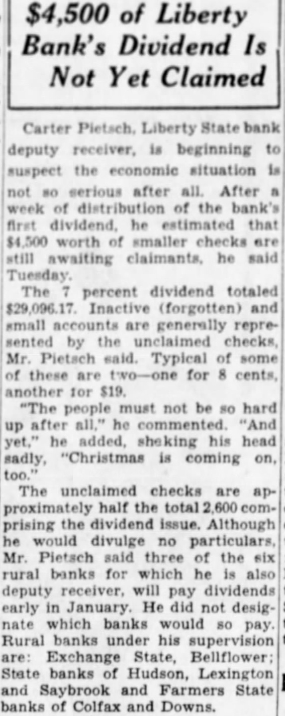 $4,500 of Liberty Bank's Dividend Is Not Yet Claimed Carter Pietsch, Liberty State bank deputy receiver, is beginning to suspect the economic situation is not so serious after all. After week of distribution of the bank's first dividend. he estimated that 500 worth of smaller are still awaiting claimants, he said The percent dividend totaled $29,096.17. Inactive (forgotten) and small accounts are generally represented by the unclaimed checks, Mr. Pietsch said. Typical of some of these are for 8 cents, another for $19. "The people must not be so hard up after all," he commented. "And yet," he added, sheking his head sadly, "Christmas is coming on. The unclaimed checks are approximately half the total 600 comprising the dividend issue. Although he would divulge no particulars, Mr. Pietsch said three of the six rural banks for which he is also deputy receiver, will pay dividends early in January. He did not designate which banks would so pay. Rural banks under his supervision are: Exchange State, Bellflower: State banks of Hudson, Lexington and Saybrook and Farmers State banks of Colfax and Downs.