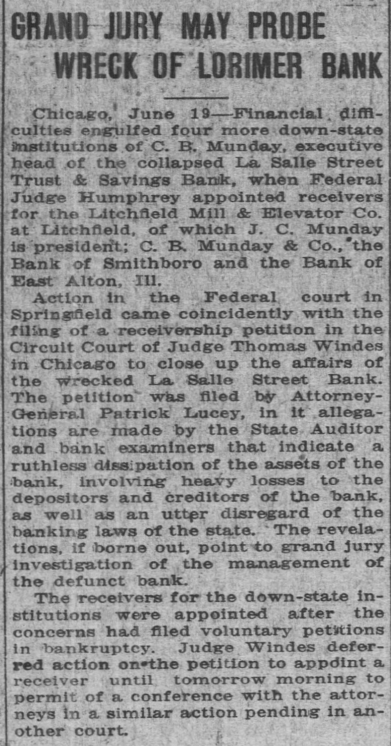 GRAND JURY MAY PROBE WRECK OF LORIMER BANK Chicago, June 19-Financial diffculties engulfed four more down-state institutions of C. B. Munday, executive head of the collapsed La Salle Street Trust & Savings Bank, when Federal Judge Humphrey appointed receivers for the Litchfield Mill & Elevator Co. at Litchfield, of which J. C. Munday is president; C. B. Munday & Co., the Bank of Smithboro and the Bank of East Alton, III. Action in the Federal court in Springfield came coincidently with the filing of a receivership petition in the Circuit Court of Judge Thomas Windes in Chicago to close up the affairs of the wrecked La Salle Street Bank. The petition was filed biy AttorneyGeneral Patrick Lucey, in it allegations are made by the State Auditor and bank examiners that indicate a ruthless dissipation of the assets of the bank, involving heavy losses to the depositors and creditors of the bank, as well as an utter disregard of the banking laws of the state. The revelations, if borne out, point to grand jury investigation of the management of the defunct bank. The receivers for the down-state institutions were appointed after the concerns had filed voluntary petitions in bankruptcy. Judge Windes deferred action on the petition to appoint a receiver until tomorrow morning to permit of a conference with the attorneys in a similar action pending in another court.