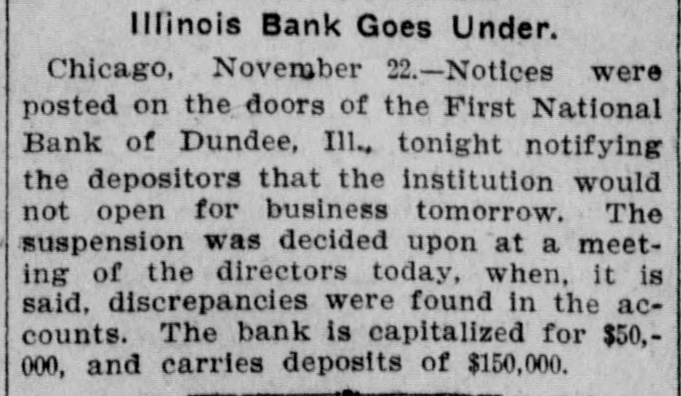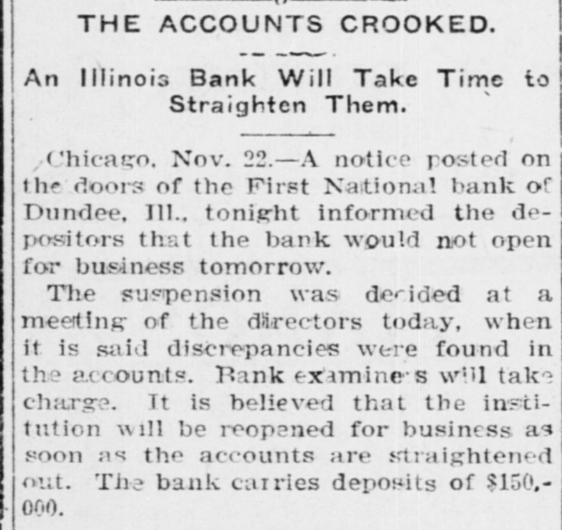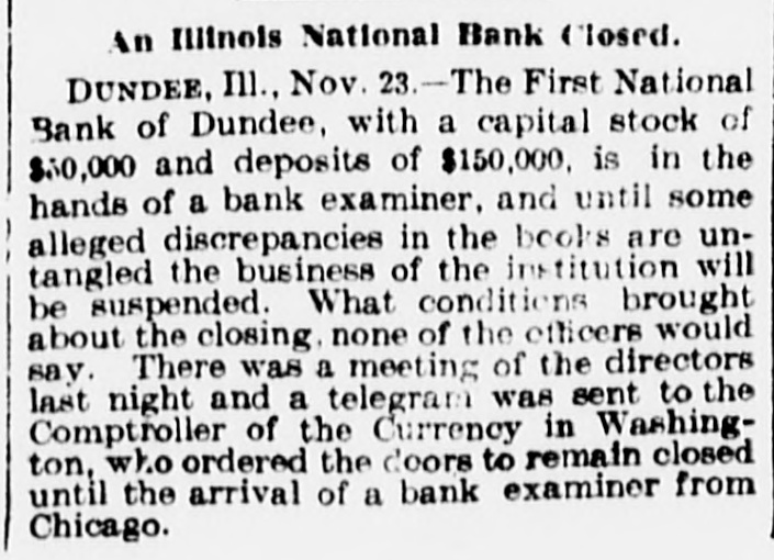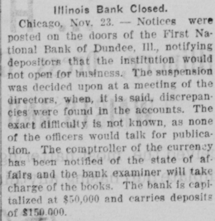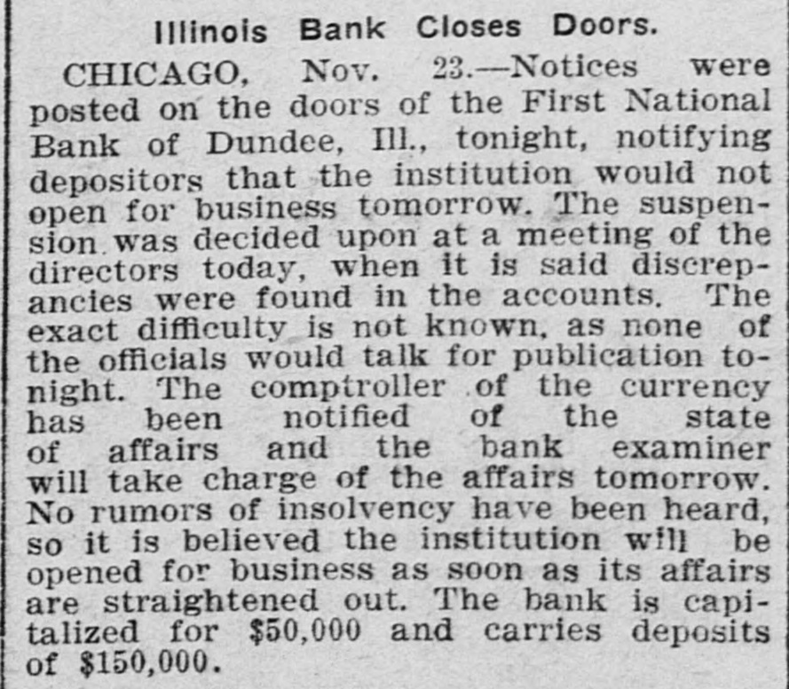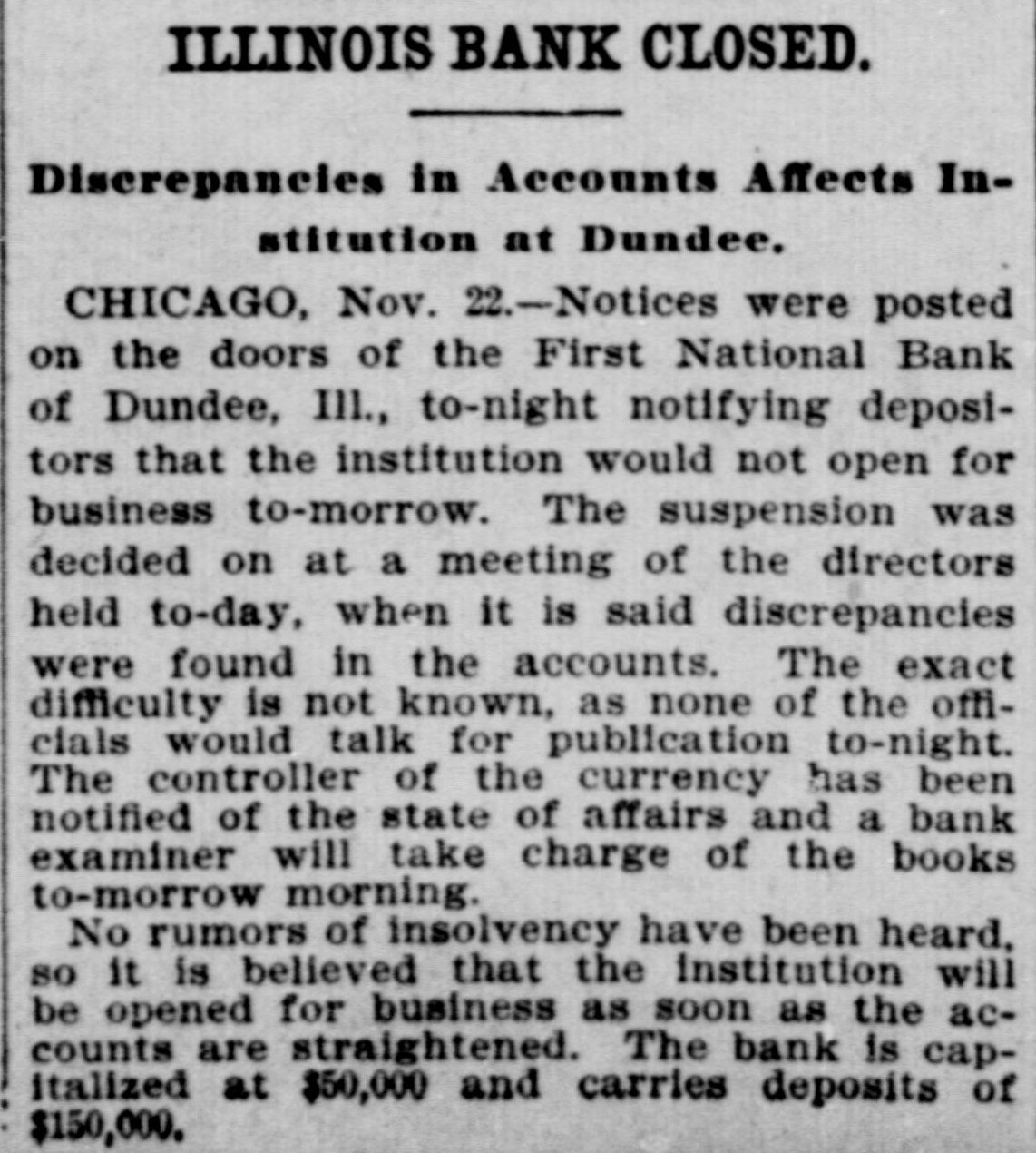 Illinois Bank Closes Doors. CHICAGO, Nov. 23.-Notices were posted on the doors of the First National Bank of Dundee, Ill., tonight, notifying depositors that the institution would not open for business tomorrow. The suspension was decided upon at a meeting of the directors today, when it is said discrepancies were found in the accounts. The exact difficulty is not known, as none of the officials would talk for publication tonight. The comptroller of the currency has been notified of the state of affairs and the bank examiner will take charge of the affairs tomorrow. No rumors of insolvency have been heard, so it is believed the institution will be opened for business as soon as its affairs are straightened out. The bank is capitalized for $50,000 and carries deposits of $150,000.