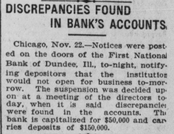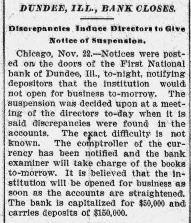 DUNDEE, ILL., BANK CLOSES. Discrepancies Induce Directors to Give Notice of Suspension. Chicago, Nov. 22.-Notices were posted on the doors of the First National bank of Dundee, III., to-night, notifying depositors that the institution would not open for business to-morrow. The suspension was decided upon at a meeting of the directors to-day when it is said discrepancies were found in the accounts. The exact difficulty is not known. The comptroller of the currency has been notified and the bank examiner will take charge of the books to-morrow. It is believed that the institution will be opened for business as soon as the accounts are straightened. The bank is capitalized for $50,000 and carries deposits of $150,000.