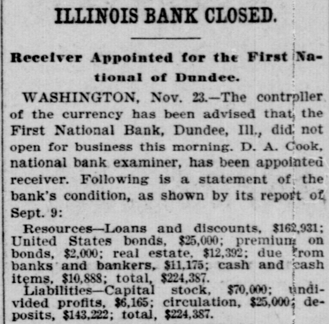 ILLINOIS BANK CLOSED. Receiver Appointed for the First National of Dundee. WASHINGTON, Nov. 23.-The controller of the currency has been advised that the First National Bank, Dundee, III., did not open for business this morning. D. A. Cook, national bank examiner, has been appointed receiver. Following is a statement of the bank's condition, as shown by its report of Sept. 9: Resources-Loans and discounts, $162,931; United States bonds, $25,000; premium on bonds, $2,000; real estate, $12,392; due from banks and bankers, $11,175; cash and cash items, $10,888; total, $224,387. Liabilities-Capital stock, $70,000; úndivided profits, $6,165; circulation, $25,000; deposits, $143,222; total, $224,387.