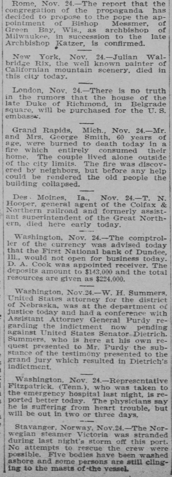 Rome, Nov. 24.-The report that the congregation of the propaganda has decided to propose to the pope the appointment of Bishop Messmer, of Green Bay, Wis., as archbishop of Milwaukee, in succession to the late Archbishop Katzer, is confirmed. New York, Nov. 24.-Julian Walbridge Rix, the well known painter of Californian mountain scenery, died in this city today. / London, Nov. 24.-There is no truth in the rumors that the house of the late Duke of Richmond, in Belgrade square, will be purchased for the U.S. embassv. I Grand Rapids, Mich., Nov. 24.-Mr. and Mrs. George Smith, 60 years of age, were burned to death today in a fire which entirely consumed their home. The couple lived alone outside of the city limits. The fire was discovered by neighbors, but before any help could be rendered the old people the building collapsed. / Des. Moines, Ia., Nov. 24.-T. N. Hooper, general agent of the Colfax & Northern railroad and formerly assistant superintendent of the Great Northern, died here early today. ---Washington, Nov. 24.-The comptroller of the currency was advised today that the First National bank of Dundee, III., would not open for business today. D. A. Cook was appointed receiver. The deposits amount to $143,000 and the total resources are given as $224,000. Washington, Nov.24.-W. H. Summers, United States attorney for the district of Nebraska, was at the department of justice today and had a conference with Assistant Attorney General Purdy regarding the indictment now pending against United States Senator Dietrich. Summers, who is here at his own request presented to Mr. Purdy the substance of the testimony presented to the grand jury which resulted in Dietrich's indictment. Washington, Nov. 24.-Represcntative Fitzpatrick, (Tenn.), who was taken to the emergency hospital last night, is reported better today. The physicians say he is suffering from heart trouble, but will be out in two or three days. I Stavanger, Norway, Nov.24.-The Norwegian steamer Victoria was stranded during last night's storm off this port. No attempts to rescue the crew were possible. Five bodies have been washed ashore and some persons are still clinging to the masts of the vessel.