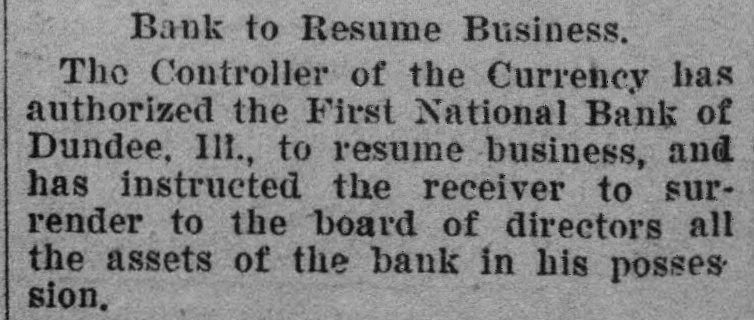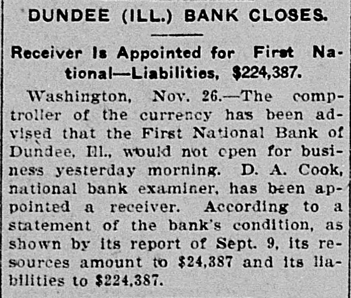 Washington, Nov. 23.-The controller of the currency was advised today that the First National bank of Dundee, Ills., would not open for business today. D. A. Cook was appointed receiver. The deposits amount to $143,000 and the total resources are given as $224,000.