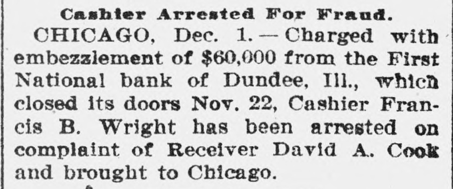 Cashier Arrested For Fraud. CHICAGO, Dec. 1. - Charged with embezzlement of $60,000 from the First National bank of Dundee, Ill., which closed its doors Nov. 22, Cashier Francis B. Wright has been arrested on complaint of Receiver David A. Cook and brought to Chicago.