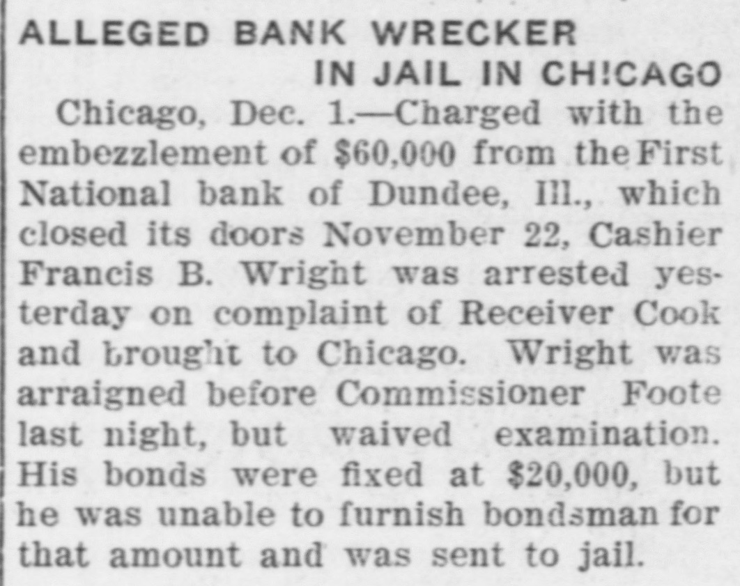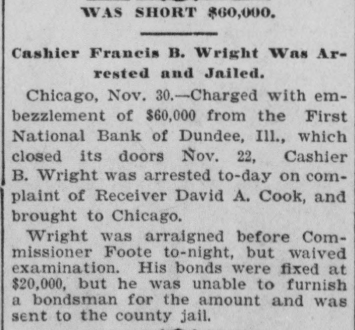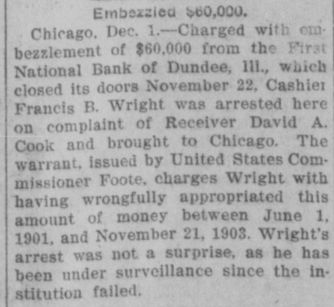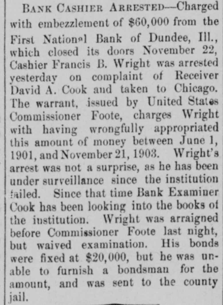 BANK CASHIER ARRESTED-Charged with embezzlement of $60,000 from the First National Bank of Dundee, Ill., which closed its doors November 22, Cashier Francis B. Wright was arrested yesterday on complaint of Receiver David A. Cook and taken to Chicago. The warrant, issued by United States Commissioner Foote, charges Wright with having wrongfully appropriated this amount of money between June 1, 1901, and November 21, 1903. Wright's arrest was not a surprise, as he has been under surveillance since the institution tailed. Since that time Bank Examiner Cook has been looking into the books of the institution. Wright was arraigned before Commissioner Foote last night, but waived examination. His bonds were fixed at $20,000, but he was unable to furnish a bondsman for the amount, and was sent to the county jail.