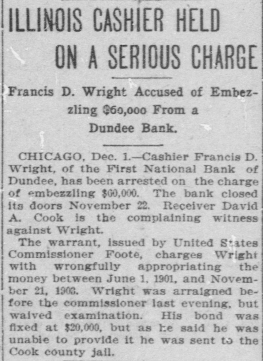 ILLINOIS CASHIER HELD ON A SERIOUS CHARGE Francis D. Wright Accused of Embezzling $60,000 From a Dundee Bank. CHICAGO, Dec. 1.-Cashier Francis D. Wright, of the First National Bank of Dundee, has been arrested on the charge of embezzling $60,000. The bank closed its doors November 22. Receiver David A. Cook is the complaining witness against Wright. The warrant, issued by United States Commissioner Foote, charges Wright with wrongfully appropriating the money between June 1, 1901, and November 21, 1903. Wright was arraigned before the commissioner last evening, but waived examination. His bond was fixed at $20,000, but as he said he was unable to provide it he was sent to the Cook county jail.