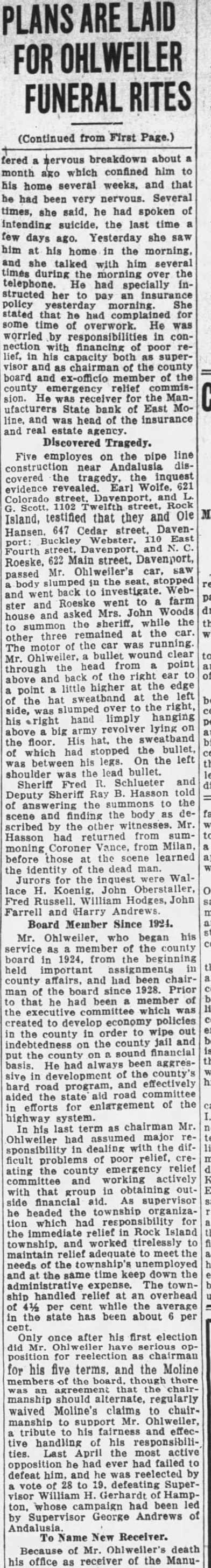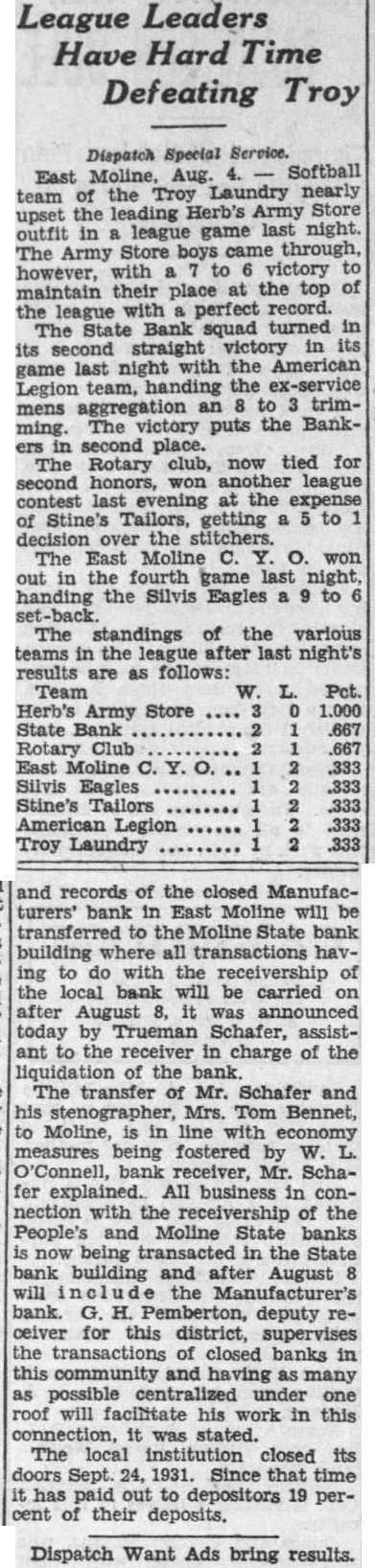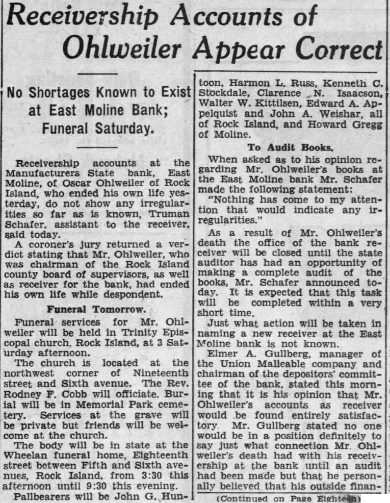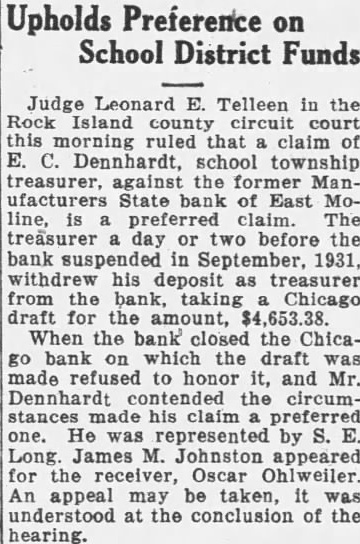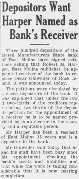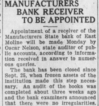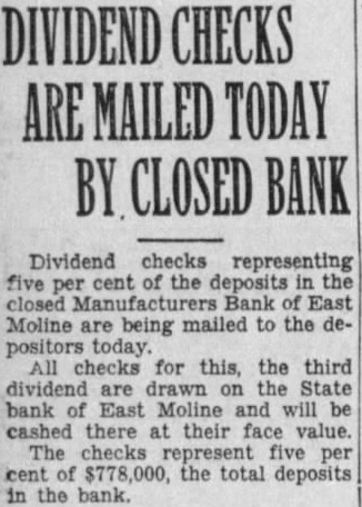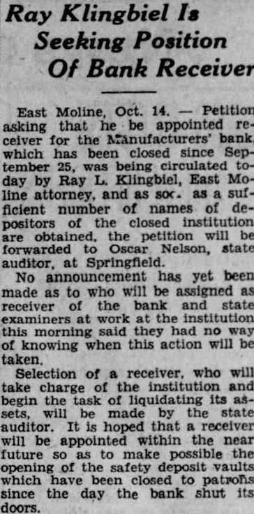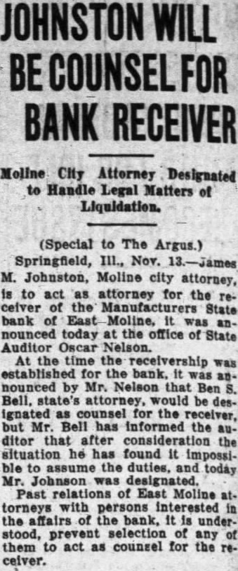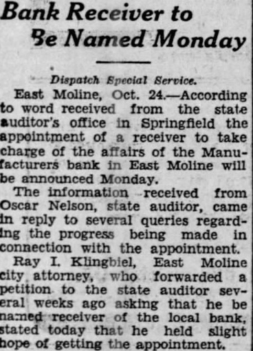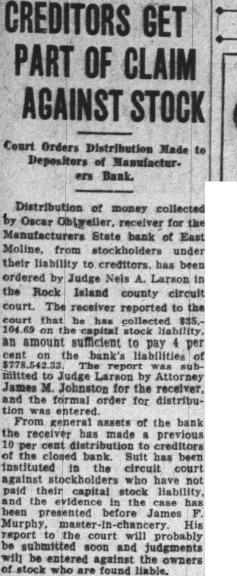 Manufacturers State Bank of East covered None 52,073.41 and advancefund. receipts loss settlement state 7,055.93 expense expense 3,800.96 expense 2,730.12 spe300.00 and 170,000.00 bank building pense) 10,288.13 Total hands receiver Total Interest account Total collections from Receiver's Accountant' fee expense, in hands Total from bank 15% cent common assessment liability suit, the sum of been from the former this bank and the hands the disbursement at early date. Dividend Payments In the case of the Peoples SavBank Trust per cent has to the general claimants against bank. the Moline State Trust Savings Bank, paid to date. In the case of the State Bank East Moline 15 cent has been paid from the ceipts of assets of from the bank stockholders' Fifth Avenue Trust Savings Bank has paid 20 per in dividends from the stock assessment the cial Bank paid per in the and stock fund. The attorney for Peoples Savings Bank Clyde Walker and the case the Moline State Trust Savings Bank, Sinnett Britton counsel ceiver. James M. Johnston torney Manufacturers State Bank of East Moline, Railsback Fifth Trust Savings Bank Sinnett Britton recently Harper, former attorney for the the SavBank, resigned when William O'Connell took charge this bank. premiums and interest 64,536.92 3,311.48 receipts by 55,612.12 state 10,050.00 salary expense stenographer expense 16,259.96 expense 3,503.87 banking spe960.00 rediscounts 47,288.27 bills payadvancements, Total in hands receiver Total Stockholders' Liability RECEIPTS holders Receiver's and Balance in hands receiver Total paid from bank 16% assessment None