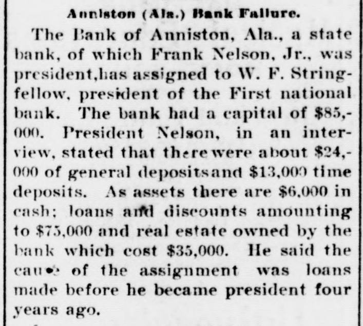 Anniston (Ala.) Bank Failure. The Bank of Anniston, Ala., a state bank, of which Frank Nelson, Jr., was president, has assigned to W. F. Stringfellow, president of the First national bank. The bank had a capital of $85,000. President Nelson, in an interview, stated that therewere about $24,000 of general depositsand $13,000 time deposits. As assets there are $6,000 in cash: loans and discounts amounting to $73,000 and real estate owned by the bank which cost $35,000. He said the cause of the assignment was loans made before he became president four years ago.