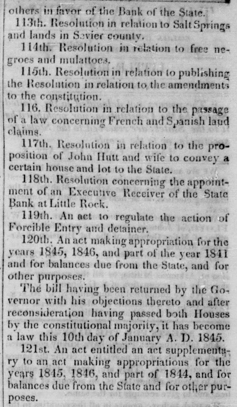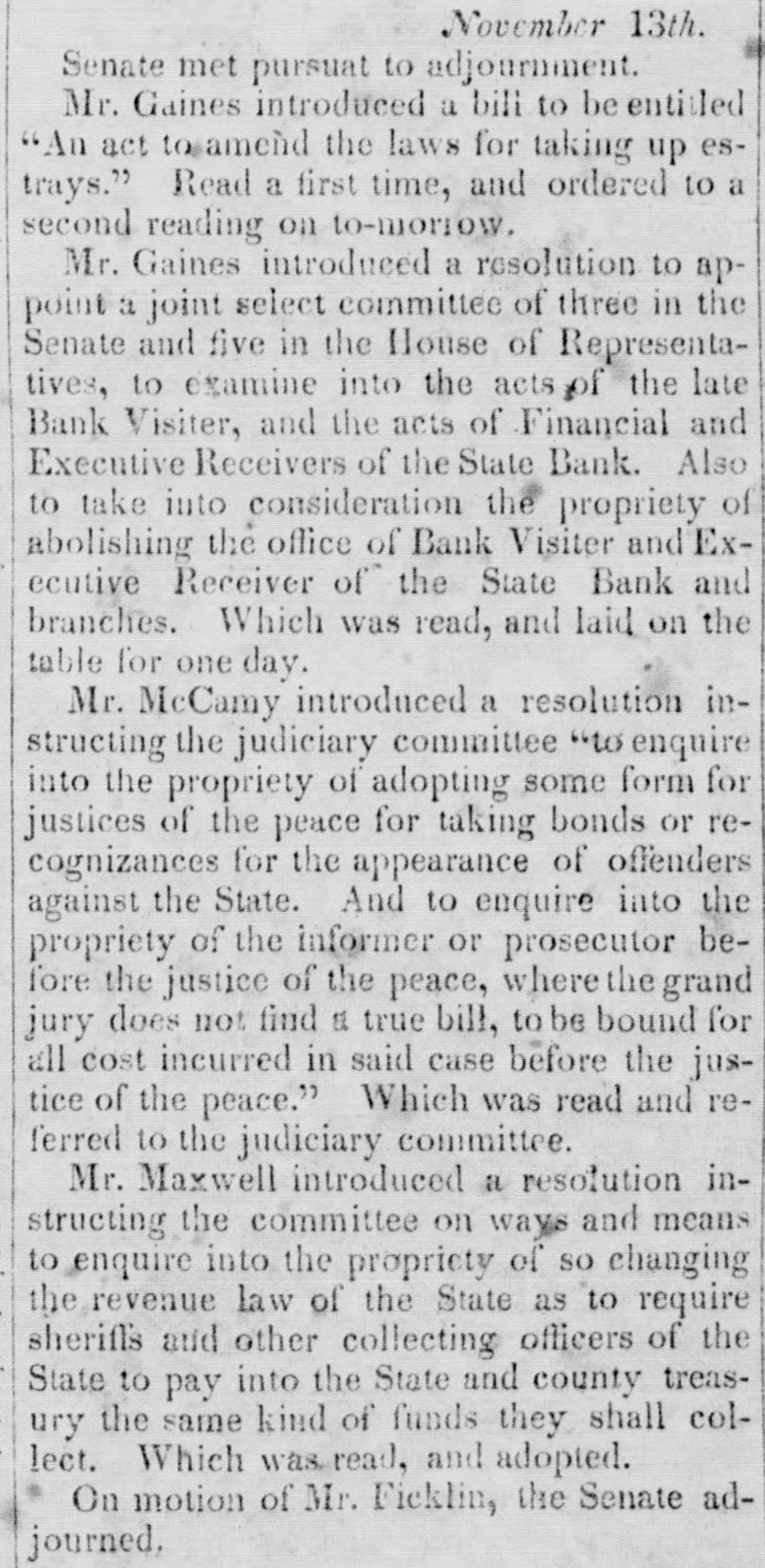 ne on of appropriations State Treasury, excess and payable out of officers the and Bank Agents, account of above Bank the $32,666 66, executed paid by the Bank to for money borrowed Estate over the State Governor and redeem 32 bonds Gener- of the by Real 17th. To Bank. pay salaries 00. of Adjutant for il of 18th. the To State, pay $100 for advertising landssale for taxes, $350 Agents 00. for selecting or loca- 00; 19th. To pay 500,000 acres, $3,500 ting to lands provide of the that the Internal expenses, which shall iccurred, defray its and own which have of been out of the ordinary shall fund, have and payable The Auditor improvement Revenue been, the State Treasury. of the to fund, accruing donated to 500,000 acres Internal provement charge and the are the account of of land from Internal the Improve- the sale said Im- the of State for the the sum purpose of $15,500 00, the and Internal ment,) shall be reimbursed into the from State Treasury, shall be when received by the said fund on the sum Improvement fund Treasurer Au- for placed and to the credit and be of used as other funds of the Here expenses follows a number Small of sums for to of services, ditor's the ent various kinds books, persons of State. &c. enacted, appropriations That differ- the Re it further of the State Financial Receiver at the Little Rock, be if and of authorised and of the Real hereby SEC. Arkansas 2. of the required, Bank practica- which he Es- is exchange any notes hand, or Bank and State Bank, for shall be sold on hand by the State, and thereon, to pay for bonds and time of such bonds, State tate ble, to due at Branches the the in interest the on par purchase only, which State said and or with said so redeemed shall that any and filed with cancelled, exchange may be State bonds duplicate notes the at receipts State Treasurer, therefor, Auditor. be who shall grant be filed with the take the Financial receipts be redeemed, and such bonds the amount paid for to redeem separately duplicate any one And of which shall shall from Receiver interest, the person shall principal from also showing whom such file the the amount one paid of which for receipts he shall Sec. 3. Be hand, or in the funds now on of the Bank bonds, with Auditor. it further enacted, the That hands of here- all the par Financial Receiver which may of Arkansas, in any wise, after come to said into Bank, except special be immediately longing State of the his and hands shall all deposites placed beunder the made by individuals, to the State Treasury, of the and Treasurer of the State, upon of said to therein transferred control his duty official responsibility. Treasurer all And it shall be after the the and passage take of charge this act, of and receive of said funds of such now in receiver the to deliver fast as they the hands to and all other par funds said as Treasurer, apply immediately and par er, for hands Receiv- same, may and one his duplicate shall file with the Auditor, credit of the such receipts as with the revenue fund. shall take come Bank which charge into he his surplus amount Treasurer, receipt of for the and That same, all who the SO of much of 4. the Be it further enacted, or which may SEC. funds now on of or in this act, be, said come par to hand, provisions the hand, of Treasury and the State, under the specially appropriated the set same apart is hereby, for the express of this purpose General of pay- As- and and the members and mileage, sembly, ing, first, both their per the diem expenses thereof first and duofficers, and to be paid for the any present of said par funds are and paid other of Sevier, is the of the State the first quarter of declared any foregoing before ring their [Mr. Brown, feature]-the purpose session, whatever, liabilities author the then- out of pre- the year, which is 1st October have commenced and to buy $1,515 the 84 direction of the (1844), books, under liabilities sent incurred fiscal during on the hereby legal worth of com- last to of And second, after the State of that the first may quarter of liabilities the present and the State ration year. mon the Auditor. school of That all the Government, be legal incurred the present incurred fiscal expi- year, fiscal shall ex- afpenses day of the of the State, ter at the Treasury when there in par in the payable be paid the be sufficient first funds, par funds and on the same. Treasury Itshall may to not any legal demand Treasurer, on application be pay the duty of the issue to him a Treasury inof warrant, the claimant, for the amount to due, bearing no terest. 5. Be it further enacted, That or member if any Sec. the State Government, Assembly, officer of the present for officer first day of said created since since or the of State General fiscal year, pay- any that liability of the the Treasury, in he is legal drawn from uncurrent funds, of ten days after shall secure to the and pay hereby funds ment time have of within authorized said liability Treasurer, to return who the said to passage uncurrent such perspecie in lieu for all specie this such act uncurrent funds, thereof, and the so Treasurer paid by