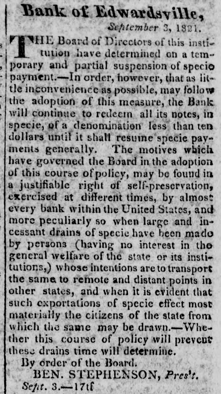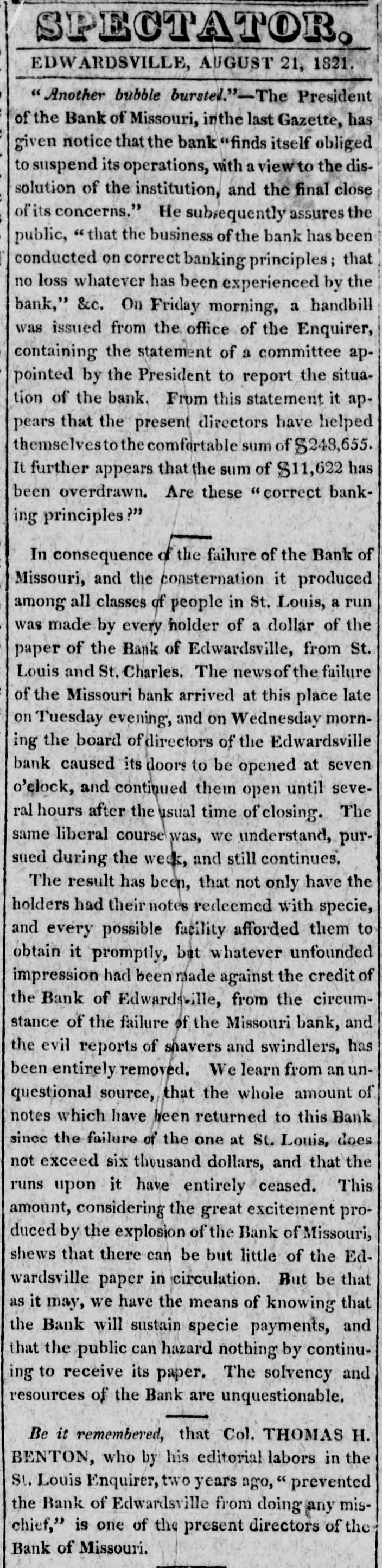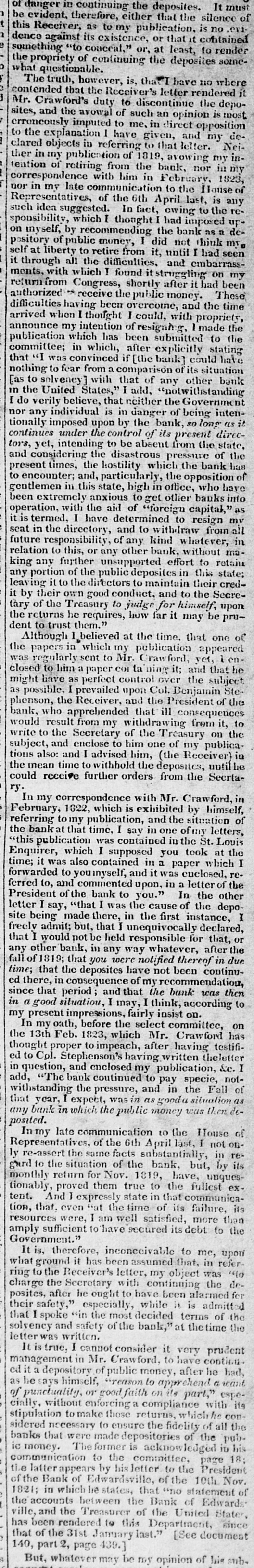 In my correspondence with Mr. Crawford, in February, 1822, which is exhibited by himself, referring to my publication, and the situation of the bank at that time, I say in one of my letters, "this publication was contained in the St. Louis Enquirer, which I supposed you took at the time; it was also contained in a paper which I forwarded to you myself, and it was enclosed, referred to, and commented upon, in a letter of the President of the bank to you." In the other letter I say, "that I was the cause of the deposite being made there, in the first instance, I freely admit; but, that I unequivocally declared, that I would not be held responsible for that, or any other bank, in any way whatever, after the fall of 1819; that you were notified thereof in due time; that the deposites have not been continued there, in consequence of my recommendation, since that period; and that the bank was then in a good situation, I may, I think, according to my present impressions, fairly insist on.