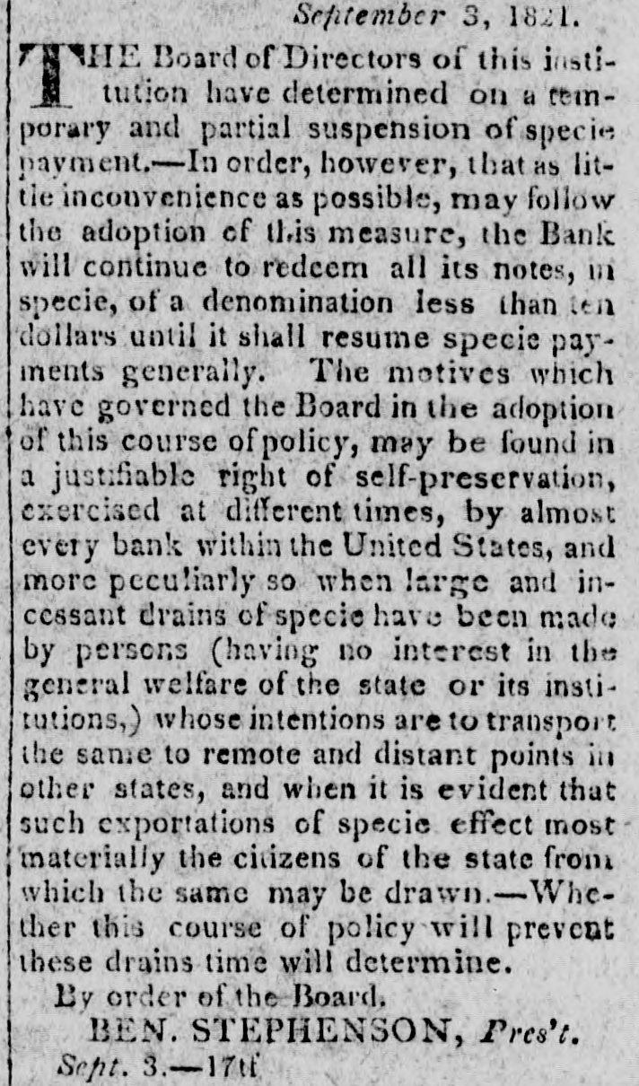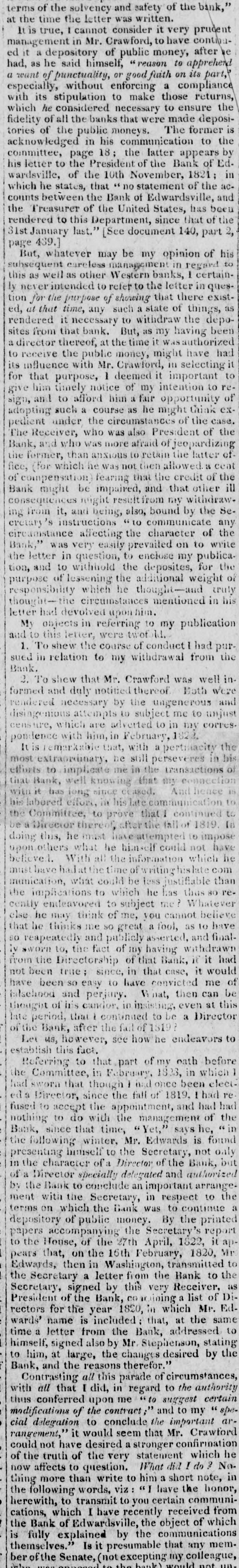 In my oath, before the select committee, on the 13th Feb. 1823, which Mr. Crawford has thought proper to impeach, after having testified to Col. Stephenson's having written the letter in question, and enclosed my publication, &c. I add, "The bank continued to pay specie, notwithstanding the pressure, and in the Fall of that year, I expect, was in as good a situation as any bank in which the public money was then deposited.