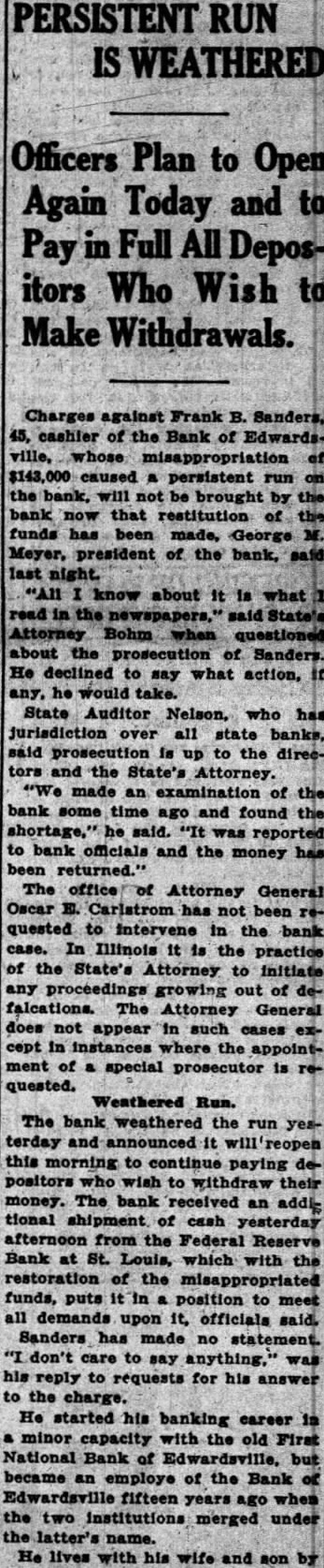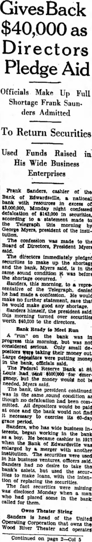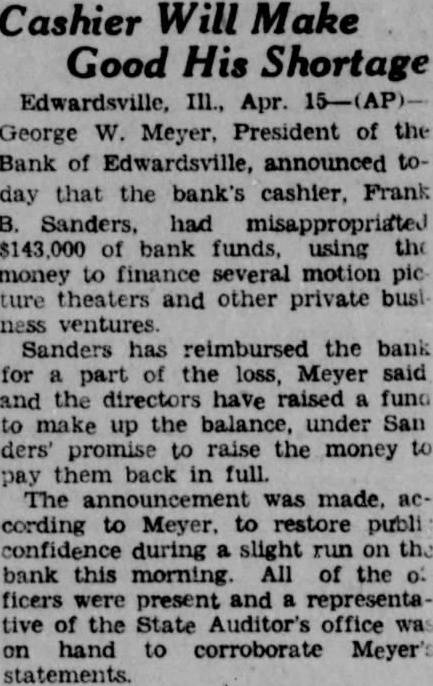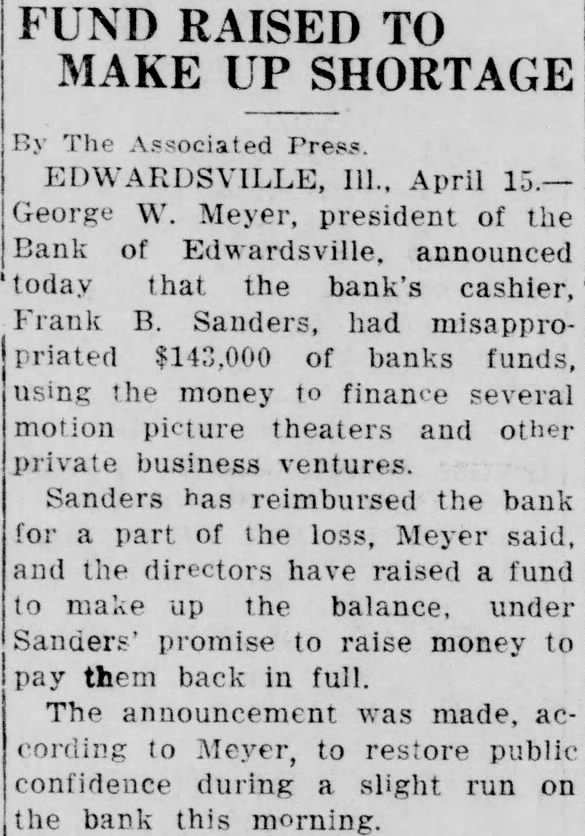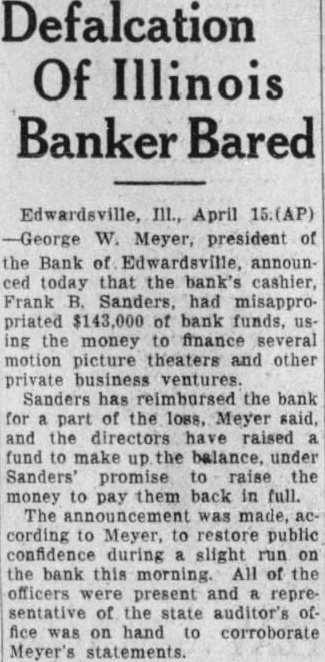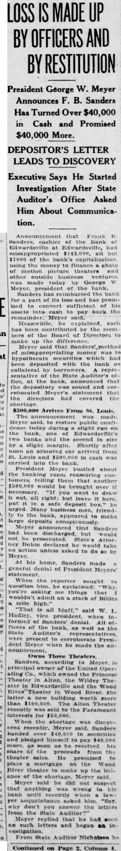 LOSS MADE OFFICERS AND RESTITUTION President George W. Meyer Announces F. Sanders Has Turned in Cash and Promised More. DEPOSITOR'S LETTER LEADS TO DISCOVERY Executive Says He Started Investigation After State Auditor's Office Asked Him About Communica- tion. Announcement that Frank cashier the Bank Edwardsville at Edwardsville, had $143,000. all but $7000 of the bank's capitalization using the money finance chain of motion picture theaters other outside business ventures. made today George Meyer. president the bank. Sanders has reimbursed the bank for part of its has promised to convert sufficient of assets to pay back the remainder, said. Meanwhile, he explained, cash has been contributed the members of the Board of Directors to make the difference. Meyer said that money which had been deposited with the bank collateral by borrowers. representative of the State Auditor's fice, at the bank, announced that the sound and roborated statement that the directors had covered the $500,000 Arrives From St. Louis. The was said, to restore public confidence today during slight run the bank, one Edwardsvflle's banks and the second in size by slight margin. Shortly after noon an armored car arrived from St. Louis and in cash carried bank. President Meyer bustled about the banking room tomers, telling them that would be brought over necessary you want draw out, all right: but leave here, put in safe deposit box," he urged. Many business men, friendto bank, appeared to make large deposits conspicuously. Meyer announced that Sanders had been discharged. but would not be prosecuted. State's ney Bohm declared he would take action unless asked to do so by Meyer. At his home. Sanders made general denial of President Meyers' statement. When the reporter sought question him, he exclaimed: "Why. asking me things that wouldn't admit on stack of Bibles mile high." "That all bluff," said W. Hadley, vice president when formed of Sanders' denial. All ficers of the bank, well the State Auditor's present to President Meyer when he made the nouncement. Owns Three Theaters. Sanders, according principal owner of the United Operating Co., which owned the Princess Theater Alton, the Wildey The ater in Edwardsville and the Wood in Wood River. the latter new building worth more than $100,000. The Alton Theater recently sold the Paramount for When the shortage was discov. ered recently, Meyer said. Sanders handed $40,000 in securities and pledged himself to pay more. soon he received his share the from the theater sales. He promised to place mortgage on the Wood River theater to make up the ance of the shortage. Meyer said. Meyer he did not that anything was in his wrong bank until recently when asked him. why don't you answer the letters from the State Meyer replied that he had no such letters and began vestigation. From State Auditor Nicholson Continued on Page Column