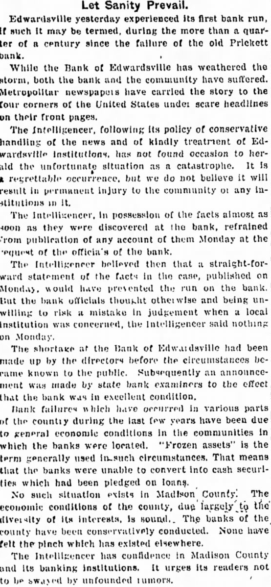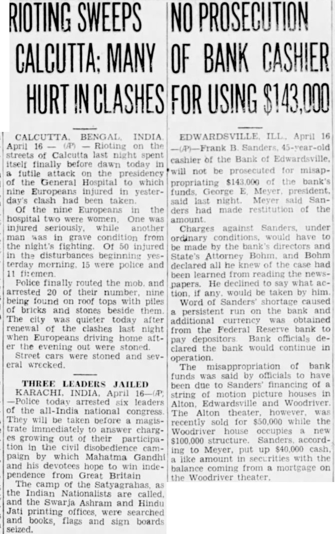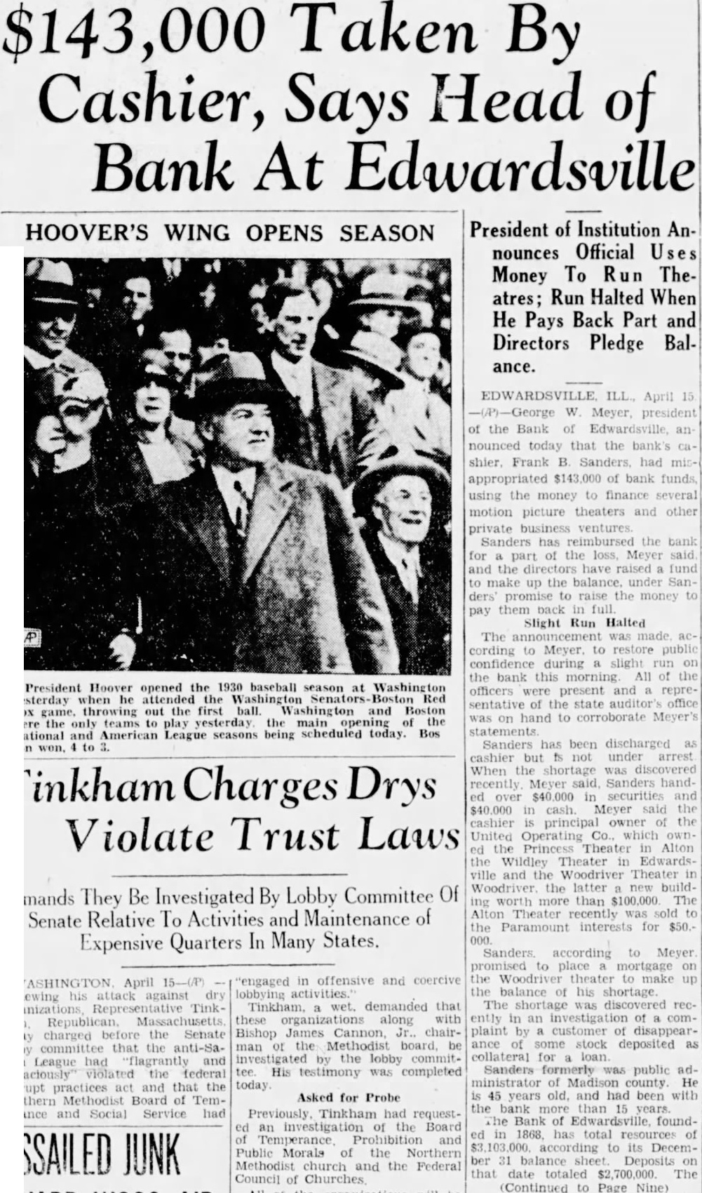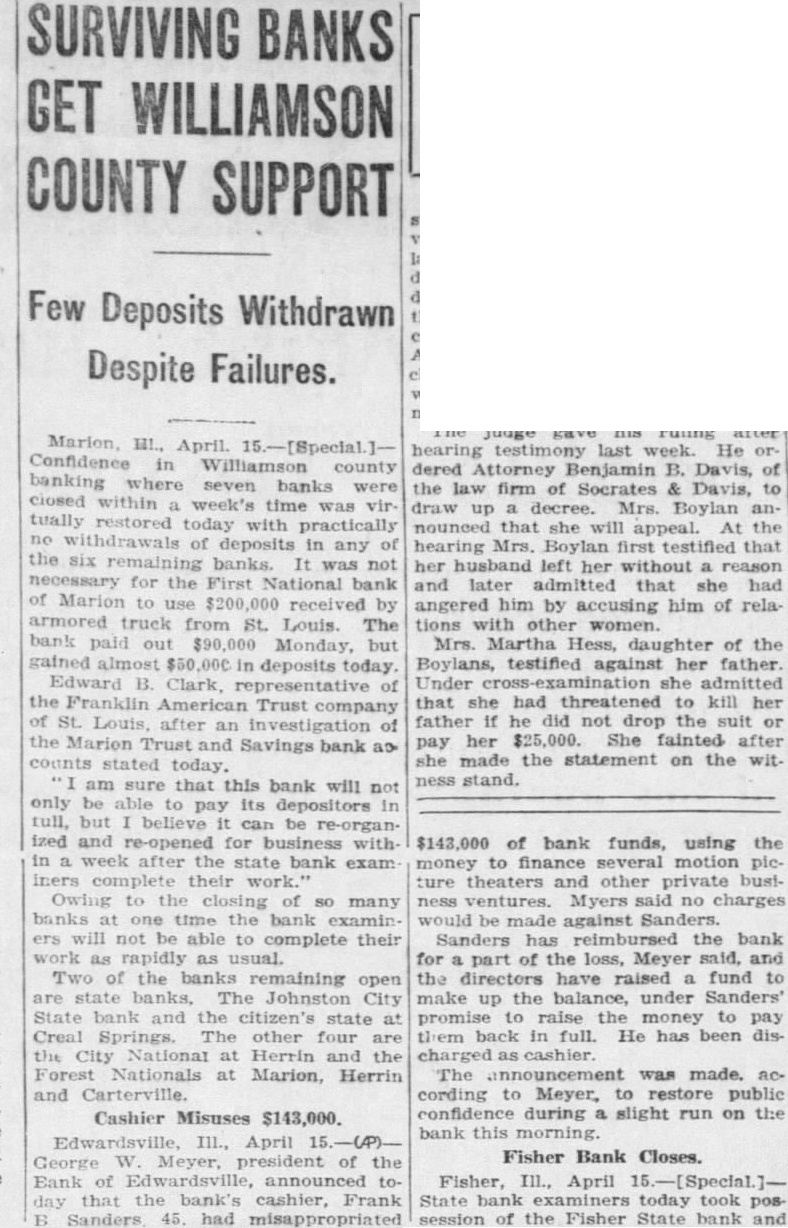 LOSS MADE OFFICERS AND RESTITUTION President George W. Meyer Announces F. Sanders Has Turned in Cash and Promised More. DEPOSITOR'S LETTER LEADS TO DISCOVERY Executive Says He Started Investigation After State Auditor's Office Asked Him About Communica- tion. Announcement that Frank cashier the Bank Edwardsville at Edwardsville, had $143,000. all but $7000 of the bank's capitalization using the money finance chain of motion picture theaters other outside business ventures. made today George Meyer. president the bank. Sanders has reimbursed the bank for part of its has promised to convert sufficient of assets to pay back the remainder, said. Meanwhile, he explained, cash has been contributed the members of the Board of Directors to make the difference. Meyer said that money which had been deposited with the bank collateral by borrowers. representative of the State Auditor's fice, at the bank, announced that the sound and roborated statement that the directors had covered the $500,000 Arrives From St. Louis. The was said, to restore public confidence today during slight run the bank, one Edwardsvflle's banks and the second in size by slight margin. Shortly after noon an armored car arrived from St. Louis and in cash carried bank. President Meyer bustled about the banking room tomers, telling them that would be brought over necessary you want draw out, all right: but leave here, put in safe deposit box," he urged. Many business men, friendto bank, appeared to make large deposits conspicuously. Meyer announced that Sanders had been discharged. but would not be prosecuted. State's ney Bohm declared he would take action unless asked to do so by Meyer. At his home. Sanders made general denial of President Meyers' statement. When the reporter sought question him, he exclaimed: "Why. asking me things that wouldn't admit on stack of Bibles mile high." "That all bluff," said W. Hadley, vice president when formed of Sanders' denial. All ficers of the bank, well the State Auditor's present to President Meyer when he made the nouncement. Owns Three Theaters. Sanders, according principal owner of the United Operating Co., which owned the Princess Theater Alton, the Wildey The ater in Edwardsville and the Wood in Wood River. the latter new building worth more than $100,000. The Alton Theater recently sold the Paramount for When the shortage was discov. ered recently, Meyer said. Sanders handed $40,000 in securities and pledged himself to pay more. soon he received his share the from the theater sales. He promised to place mortgage on the Wood River theater to make up the ance of the shortage. Meyer said. Meyer he did not that anything was in his wrong bank until recently when asked him. why don't you answer the letters from the State Meyer replied that he had no such letters and began vestigation. From State Auditor Nicholson Continued on Page Column