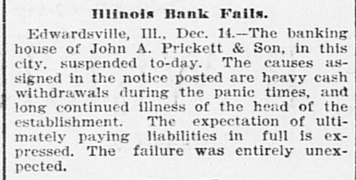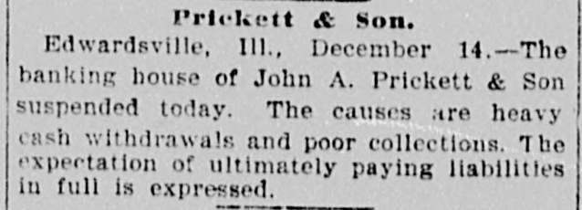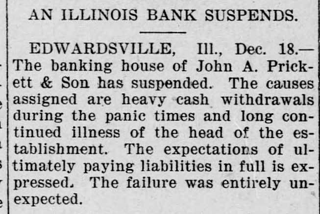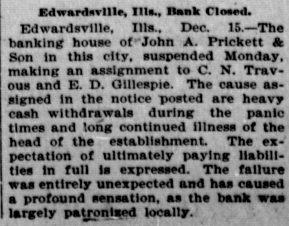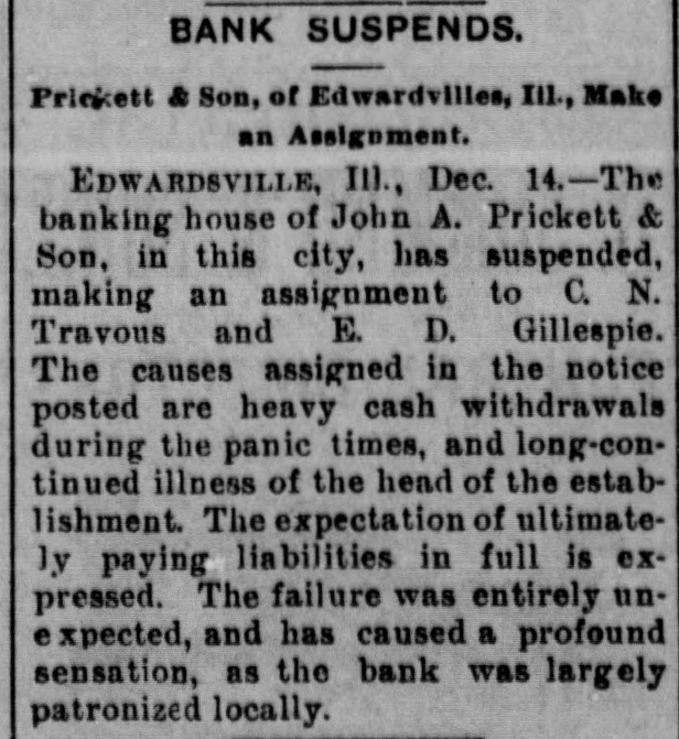 Edwardsville, Ills., Bank Closed. Edwardsville, Ills., Dec. 15.-The banking house of John A. Prickett & Son in this city, suspended Monday, making an assignment to C. N. Travous and E. D. Gillespie. The cause assigned in the notice posted are heavy cash withdrawals during the panic times and long continued illness of the head of the establishment. The expectation of ultimately paying liabilities in full is expressed. The failure was entirely unexpected and has caused a profound sensation, as the bank was largely patronized locally.