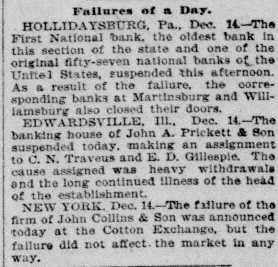 Failures of a Day. HOLLIDAYSBURG, Pa., Dec. 14-The First National bank, the oldest bank in this section of the state and one of the original fifty-seven national banks of the Unitel States, suspended this afternoon. As a result of the failure, the corresponding banks at Martinsburg and Williamsburg also closed their doors. EDWARDSVILLE, Ill., Dec. 14.-The banking house of John A. Prickett & Son suspended today. making an assignment to C. N. Traveus and E. D. Gillespie. The cause assigned was heavy withdrawals and the long continued illness of the head of the establishment. NEW YORK. Dec. 14.-The failure of the firm of John Collins & Son was announced today at the Cotton Exchange, but the failure did not affect. the market in any way.
