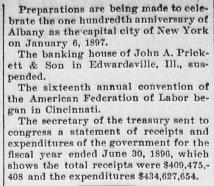 Preparations are being made to celebrate the one hundredth anniversary of Albany as the capital city of New York on January 6, 1897. The banking house of John A. Prickett & Son in Edwardsville, Ill., suspended. The sixteenth annual convention of the American Federation of Labor began in Cincinnati. The secretary of the treasury sent to congress a statement of receipts and expenditures of the government for the fiscal year ended June 30, 1896, which shows the total receipts were $409,475,408 and the expenditures $434,627,654.