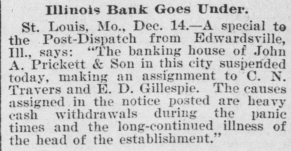 Illinois Bank Goes Under. St. Louis, Mo., Dec. 14.-A special to the Post-Dispatch from Edwardsville, Ill., says: "The banking house of John A. Prickett & Son in this city suspended today, making an assignment to C. N. Travers and E. D. Gillespie. The causes assigned in the notice posted are heavy cash withdrawals during the panic times and the long-continued illness of the head of the establishment."