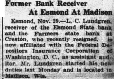 Esmond, Nov. Lundgren, receiver the Esmond State bank and the Farmers state bank Creston, who resigned. with the Federal positors Corporation itor. Mr. duties last Monday and located